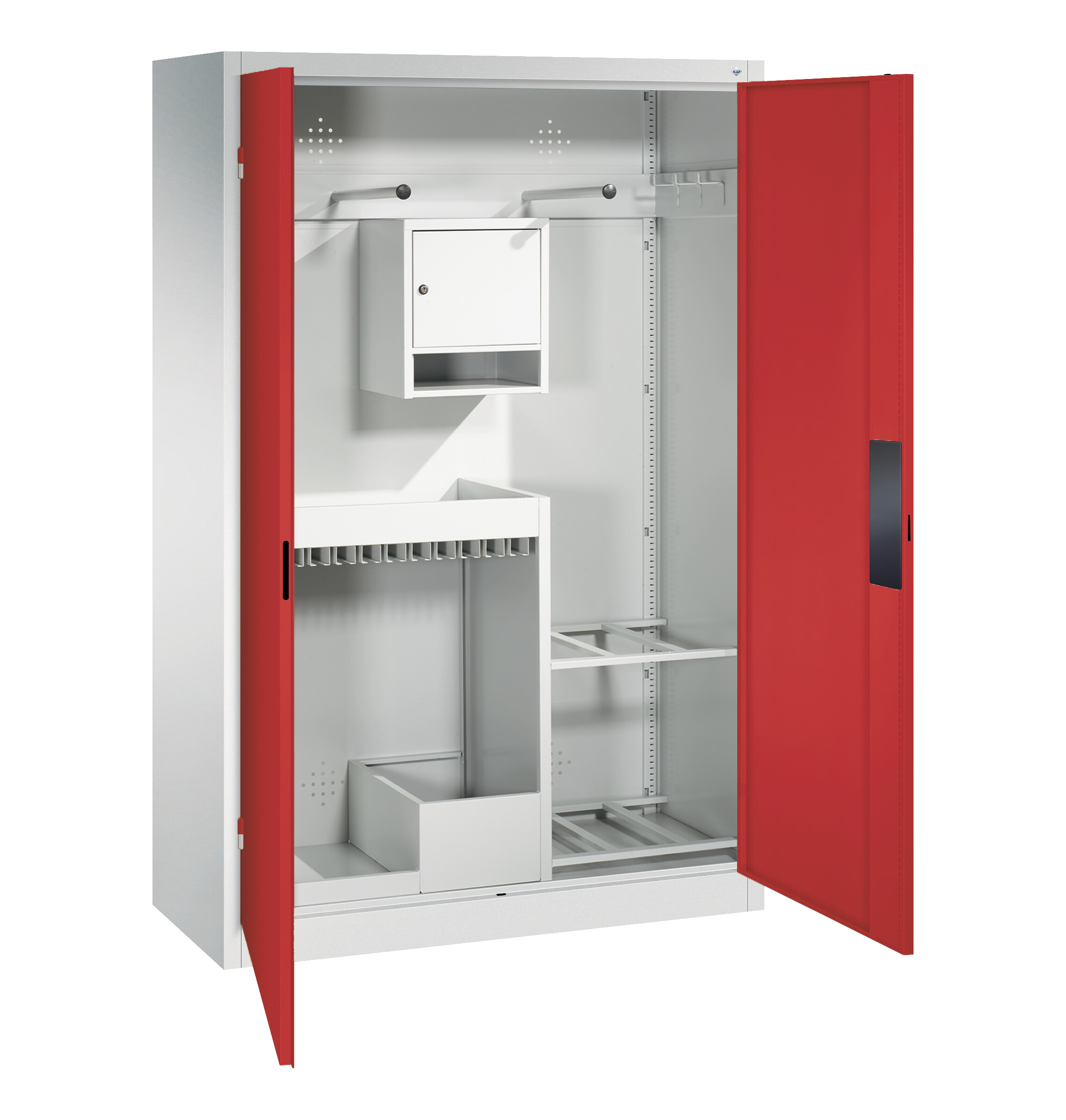 Stahl-Flügeltürenschrank Sport, als Sportgeräteschrank, Korpus aus stabiler Stahlkonstruktion mit hochwertiger Einbrennbeschichtung für hohe UV-Beständigkeit, mit Kunststoffgleitern als praktischer Schrank- und Fußbodenschutz, Rückwand mit Belüftungsöffungen, Türen verstärkt für hohe Stabilität, verdeckte Schließstangen, Türaufhängung oben und unten in außen liegenden Scharnieren mit großzügigem Öffnungswinkel ca. 180 Grad, zueinanderschlagend für gemeinsamen Verschluss, oben mittig Rückwandtraverse mit Reifenhalter, darunter Wertfach mit Zylinderschloss sowie offener Ablage, oben rechts Seitenwandtraverse mit 3 Haken z.B. als Seilhalter, unten rechts Gymnastikstangenhalter mit Trennstegen, links Modulkasten mit Ablagewannen und Turnkeulenhalter, Tür verstärkt für hohe Stabilität, Türaufhängung in außen liegenden Scharnieren mit großzügigem Öffnungswinkel ca. 180 Grad, 1 Ergonomischer Muldengriff Ergo-Lock 4.0 für optimale Bedienungssicherheit und Verschleißfestigkeit, 3-Riegel-Verschluss, mit Zylinderschloss und 2 Schlüsseln, Maße (H x B x T): 1950 x 1200 x 500 mm, Korpus: RAL 7035 Lichtgrau, Türen: RAL 3000 feuerrot, Gewicht: 88 kg