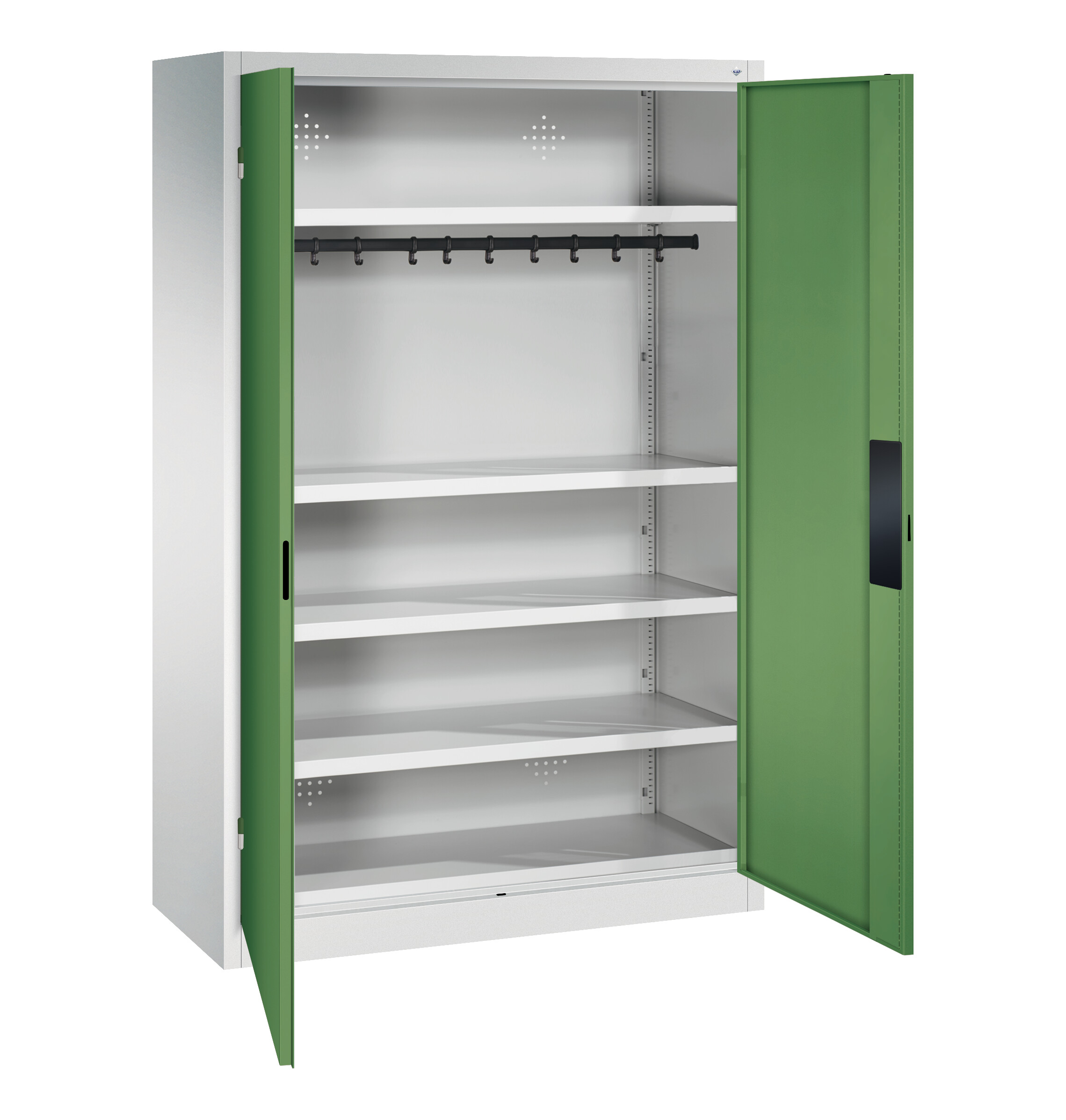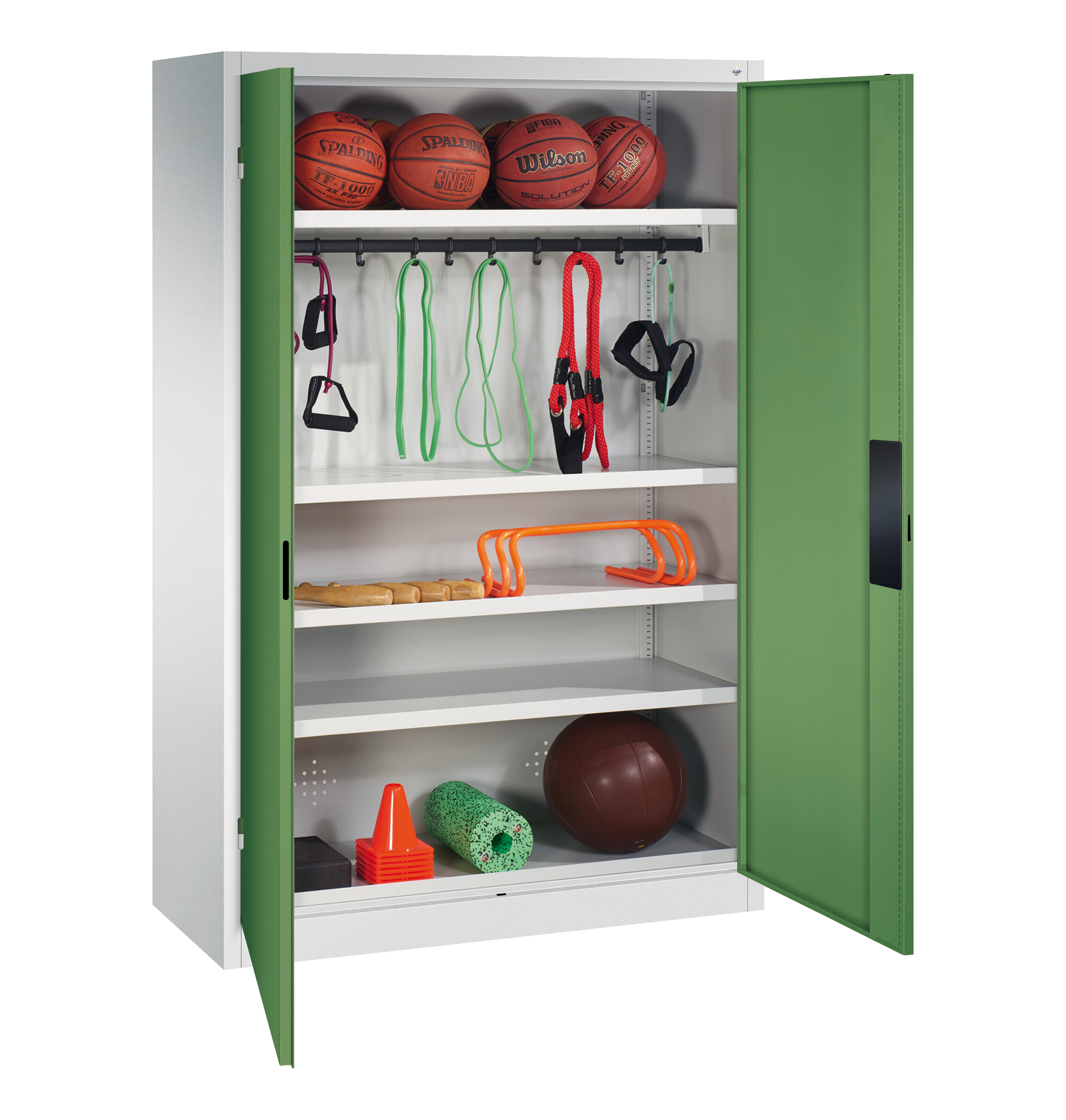 Stahl-Flügeltürenschrank Sport, als Sportgeräteschrank, Korpus aus stabiler Stahlkonstruktion mit hochwertiger Einbrennbeschichtung für hohe UV-Beständigkeit, mit Kunststoffgleitern als praktischer Schrank- und Fußbodenschutz, Rückwand mit Belüftungsöffungen, hohe Flexibilität der Inneneinrichtung durch Höhenverstellbarkeit im 15 mm Raster, Türen verstärkt für hohe Stabilität, verdeckte Schließstangen, Türaufhängung oben und unten in außen liegenden Scharnieren mit großzügigem Öffnungswinkel ca. 180 Grad, zueinanderschlagend für gemeinsamen Verschluss, Tür verstärkt für hohe Stabilität, Türaufhängung in außen liegenden Scharnieren mit großzügigem Öffnungswinkel ca. 180 Grad, 3 Einlegeböden mit vorderem Abrollrand z.B. für Bälle, aus Stahl lackiert, mit hoher Traglast von 70 kg, 1 Ablageboden mit vorderem Abrollrand z.B. für Bälle, aus Stahl lackiert, mit hoher Traglast von 70 kg, darunter integrierte Stange mit 10 Schiebehaken, 1 Ergonomischer Muldengriff Ergo-Lock 4.0 für optimale Bedienungssicherheit und Verschleißfestigkeit, 3-Riegel-Verschluss, mit Zylinderschloss und 2 Schlüsseln, Maße (H x B x T): 1950 x 1200 x 500 mm, Korpus: RAL 7035 Lichtgrau, Türen: RAL 6011 Resedagrün, Inneneinrichtung: RAL 7035 Lichtgrau, Gewicht: 83 kg