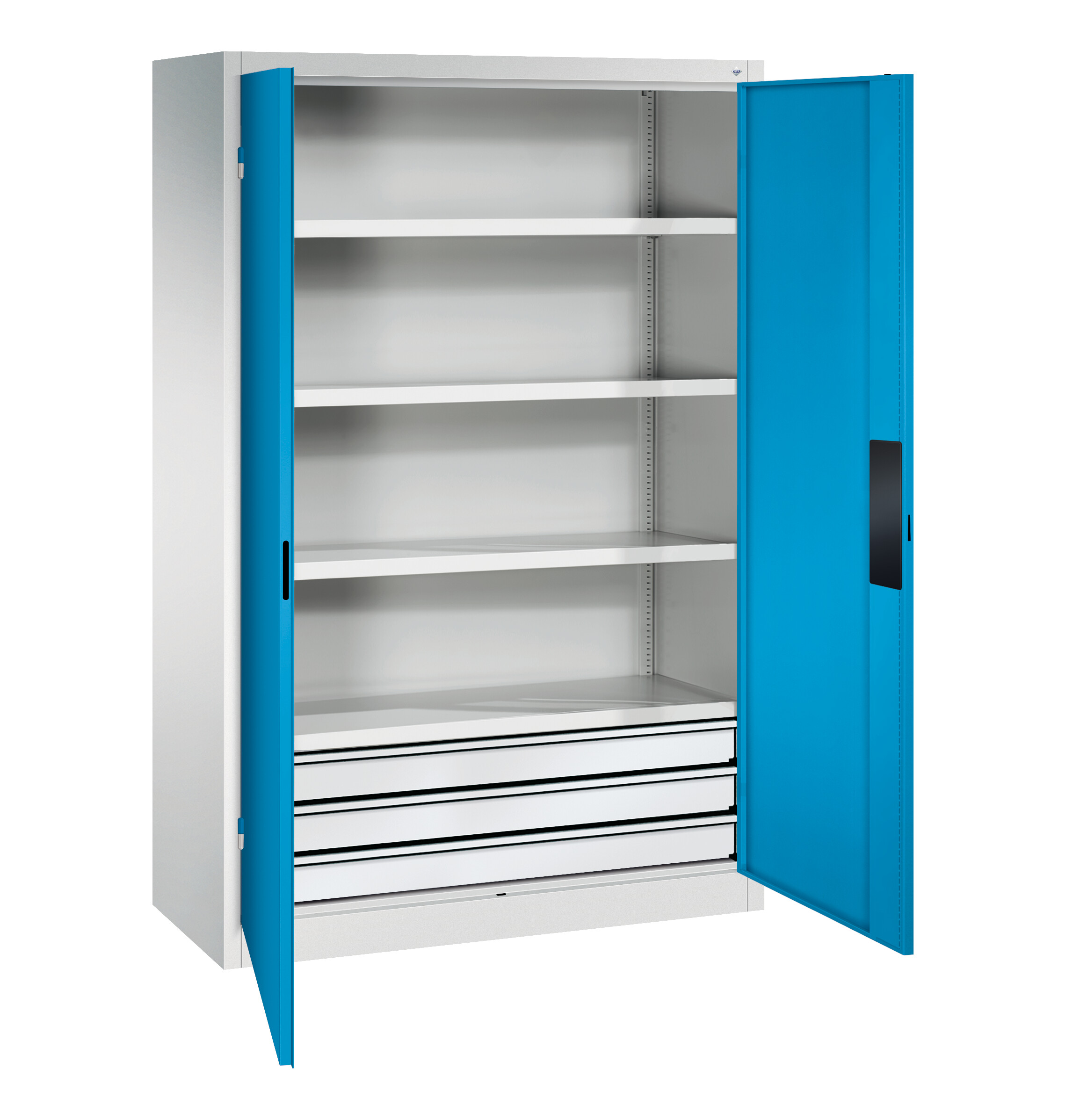 Stahl-Flügeltürenschrank Sport, als Sportgeräteschrank, Korpus aus stabiler Stahlkonstruktion mit hochwertiger Einbrennbeschichtung für hohe UV-Beständigkeit, mit Kunststoffgleitern als praktischer Schrank- und Fußbodenschutz, Rückwand mit Belüftungsöffungen, Türen verstärkt für hohe Stabilität, verdeckte Schließstangen, Türaufhängung oben und unten in außen liegenden Scharnieren mit großzügigem Öffnungswinkel ca. 180 Grad, zueinanderschlagend für gemeinsamen Verschluss, Schubladenblock mit 3 voll ausziebaren Schubladen und Teleskopschienen, Traglast 50 kg je Schub, 4 Einlegeböden lackiert mit vorderem Abrollrand z.B. für Bälle, aus Stahl lackiert, mit hoher Traglast von 70 kg, Tür verstärkt für hohe Stabilität, Türaufhängung in außen liegenden Scharnieren mit großzügigem Öffnungswinkel ca. 180 Grad, 1 Ergonomischer Muldengriff Ergo-Lock 4.0 für optimale Bedienungssicherheit und Verschleißfestigkeit, 3-Riegel-Verschluss, mit Zylinderschloss und 2 Schlüsseln, Maße (H x B x T): 1950 x 1200 x 500 mm, Korpus: RAL 7035 Lichtgrau, Türen: RAL 5012 Lichtblau, Inneneinrichtung: RAL 7035 Lichtgrau, Gewicht: 102 kg