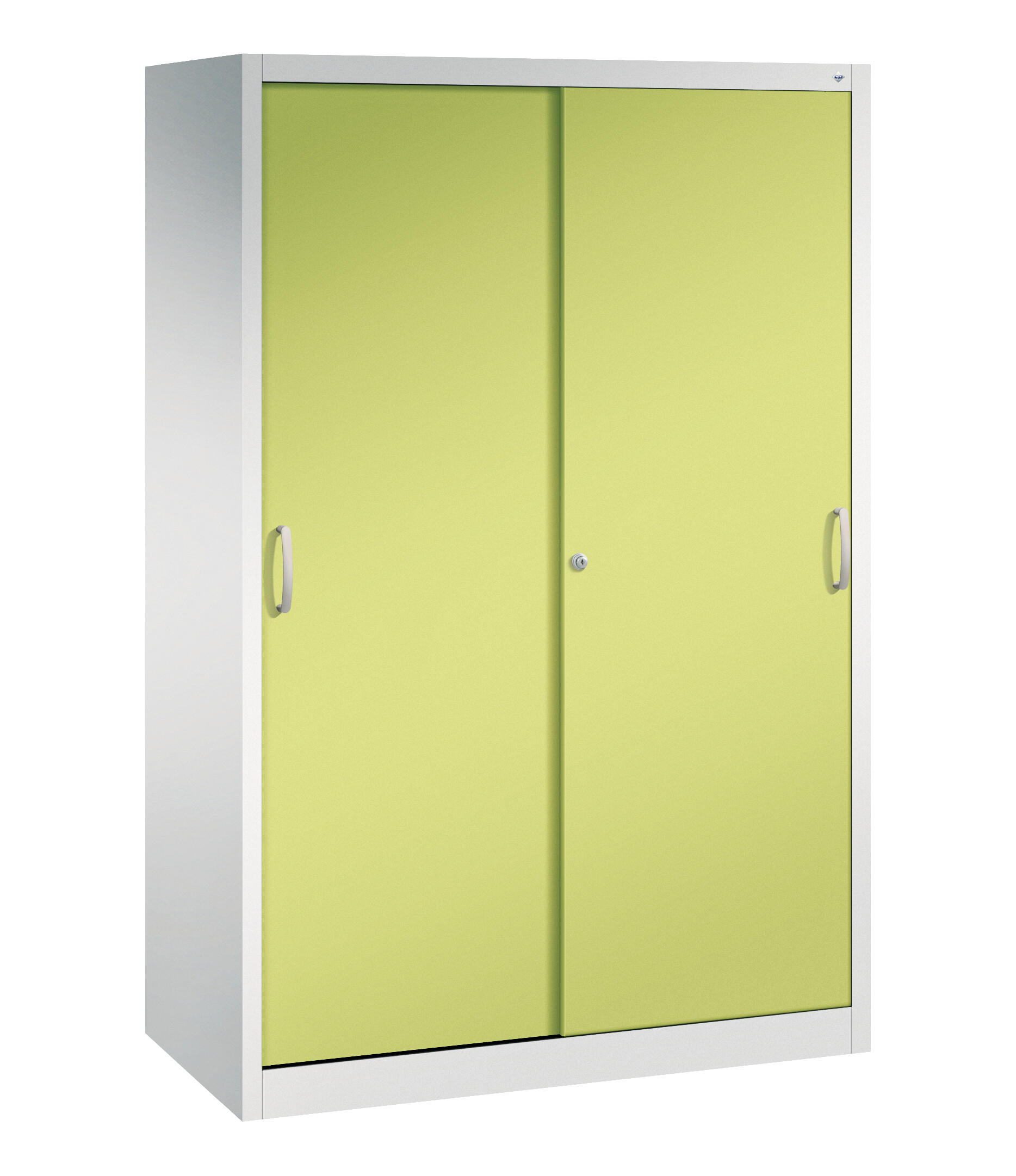 Stahl-Schiebetürenschrank Sport, als Sportgeräteschrank, Korpus aus stabiler Stahlkonstruktion mit hochwertiger Einbrennbeschichtung für hohe UV-Beständigkeit, mit Kunststoffgleitern als praktischer Schrank- und Fußbodenschutz, hohe Flexibilität der Inneneinrichtung durch Höhenverstellbarkeit im 15 mm Raster, Türen verstärkt für hohe Stabilität, leichtgängige Bedienung durch Leichtlaufrollen in spezieller Schienenführung, 2 Ergonomische Bügelgriffe Ergolock aus Metall für einfache Bedienung, matt vernickelt, 4 Einlegeböden aus Stahl, lackiert, mit vorderer Aufkantung als praktische Abrollsicherung und hoher Traglast von 70 kg, 1 Wechselzylinder matt vernickelt mit 2 Schlüsseln, Maße (H x B x T): 1950 x 1200 x 600 mm, Korpus: RAL 7035 Lichtgrau, Türen: 1108060 RDS Clowngrün, Inneneinrichtung: RAL 7035 Lichtgrau, Gewicht: 109 kg