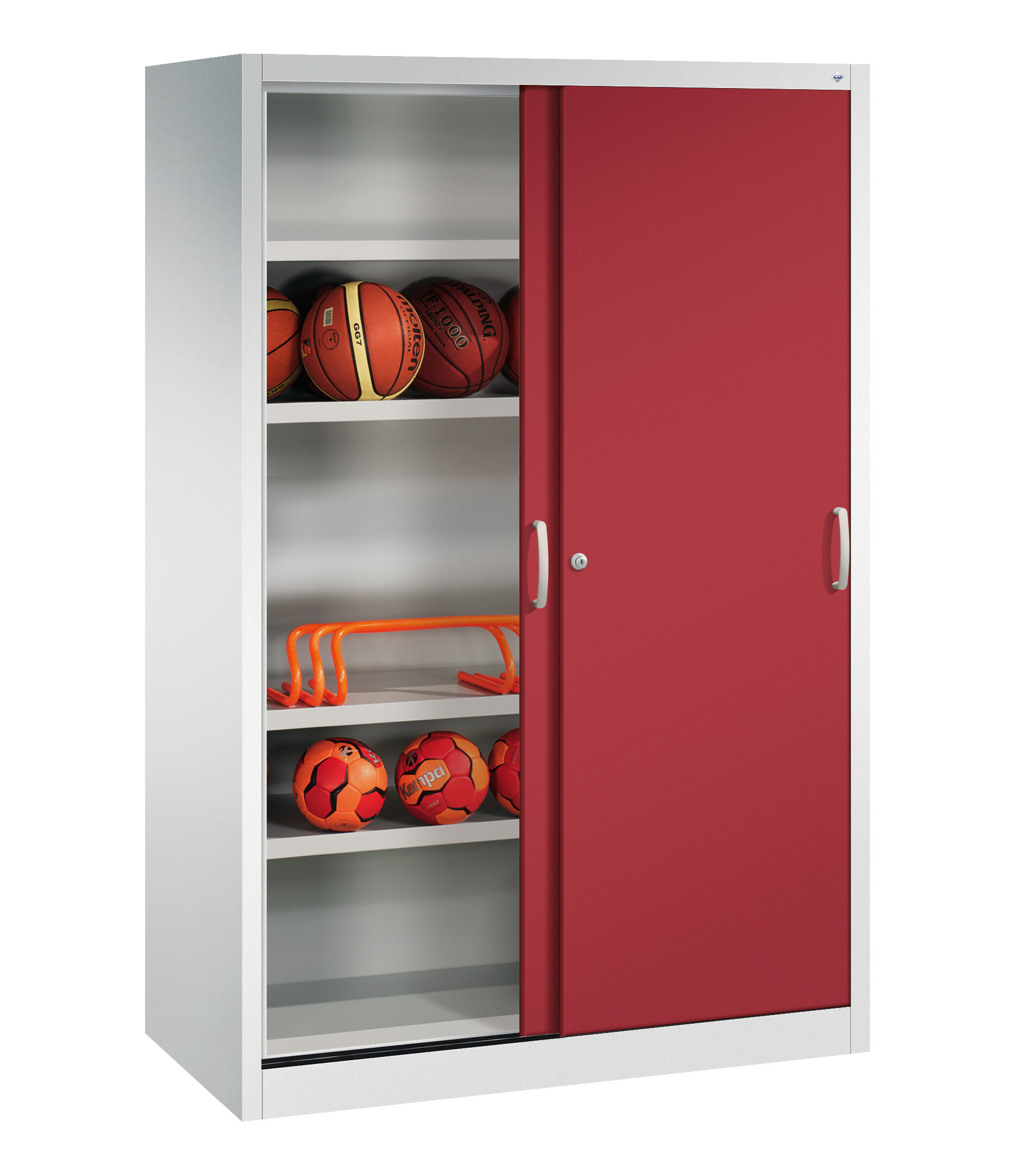 Stahl-Schiebetürenschrank Sport, als Sportgeräteschrank, Korpus aus stabiler Stahlkonstruktion mit hochwertiger Einbrennbeschichtung für hohe UV-Beständigkeit, mit Kunststoffgleitern als praktischer Schrank- und Fußbodenschutz, hohe Flexibilität der Inneneinrichtung durch Höhenverstellbarkeit im 15 mm Raster, Türen verstärkt für hohe Stabilität, leichtgängige Bedienung durch Leichtlaufrollen in spezieller Schienenführung, 2 Ergonomische Bügelgriffe Ergolock aus Metall für einfache Bedienung, matt vernickelt, 4 Einlegeböden aus Stahl, lackiert, mit vorderer Aufkantung als praktische Abrollsicherung und hoher Traglast von 70 kg, 1 Wechselzylinder matt vernickelt mit 2 Schlüsseln, Maße (H x B x T): 1950 x 1200 x 400 mm, Korpus: RAL 7035 Lichtgrau, Türen: RAL 3003 Rubinrot, Inneneinrichtung: RAL 7035 Lichtgrau, Gewicht: 59 kgProduktvorteile:Hohe Flexibilität der Inneneinrichtung durch Verstellbarkeit im 15-mm-RasterHohe Traglast des Einlegebodens von 70 kg für flexible NutzungAbrollsicher durch vordere AufkantungSchiebetüren mit langlebigen Leichtlaufrollen für beste Laufeigenschaften und komfortable BedienungAusführung mit Schiebetüren für reduzierten Flächenbedarf des Schrankes