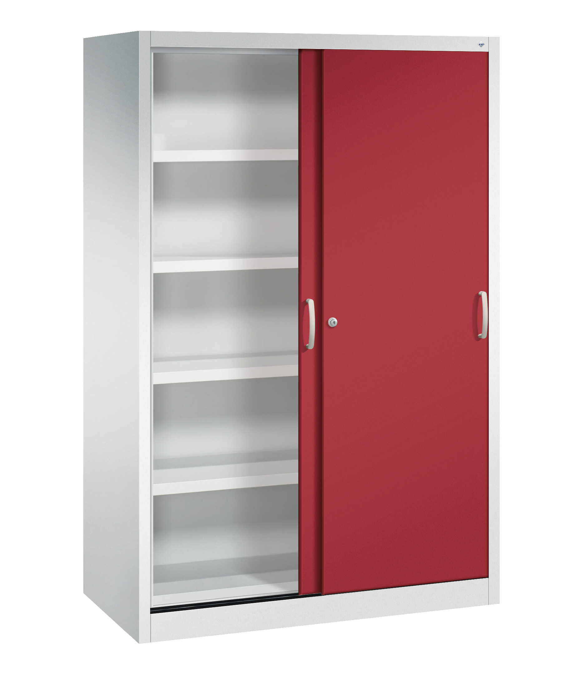 Stahl-Schiebetürenschrank Sport, als Sportgeräteschrank, Korpus aus stabiler Stahlkonstruktion mit hochwertiger Einbrennbeschichtung für hohe UV-Beständigkeit, mit Kunststoffgleitern als praktischer Schrank- und Fußbodenschutz, hohe Flexibilität der Inneneinrichtung durch Höhenverstellbarkeit im 15 mm Raster, Türen verstärkt für hohe Stabilität, leichtgängige Bedienung durch Leichtlaufrollen in spezieller Schienenführung, 2 Ergonomische Bügelgriffe Ergolock aus Metall für einfache Bedienung, matt vernickelt, 4 Einlegeböden aus Stahl, lackiert, mit vorderer Aufkantung als praktische Abrollsicherung und hoher Traglast von 70 kg, 1 Wechselzylinder matt vernickelt mit 2 Schlüsseln, Maße (H x B x T): 1950 x 1200 x 600 mm, Korpus: RAL 7035 Lichtgrau, Türen: RAL 3003 Rubinrot, Inneneinrichtung: RAL 7035 Lichtgrau, Gewicht: 109 kg