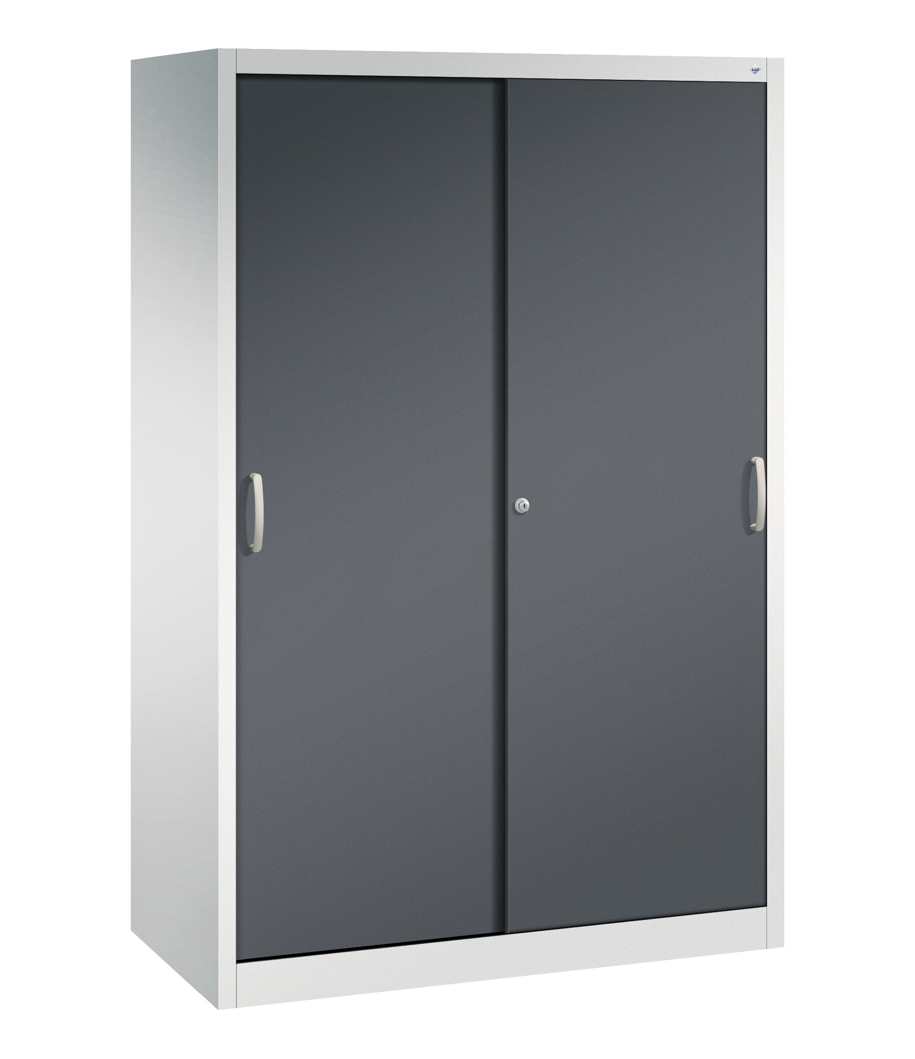 Stahl-Schiebetürenschrank Sport, als Sportgeräteschrank, Korpus aus stabiler Stahlkonstruktion mit hochwertiger Einbrennbeschichtung für hohe UV-Beständigkeit, mit Kunststoffgleitern als praktischer Schrank- und Fußbodenschutz, hohe Flexibilität der Inneneinrichtung durch Höhenverstellbarkeit im 15 mm Raster, Türen verstärkt für hohe Stabilität, leichtgängige Bedienung durch Leichtlaufrollen in spezieller Schienenführung, 2 Ergonomische Bügelgriffe Ergolock aus Metall für einfache Bedienung, matt vernickelt, 4 Einlegeböden aus Stahl, lackiert, mit vorderer Aufkantung als praktische Abrollsicherung und hoher Traglast von 70 kg, 1 Wechselzylinder matt vernickelt mit 2 Schlüsseln, Maße (H x B x T): 1950 x 1200 x 600 mm, Korpus: RAL 7016 Anthrazitgrau, Türen: RAL 7016 Anthrazitgrau, Inneneinrichtung: RAL 7035 Lichtgrau, Gewicht: 109 kgProduktvorteile:Hohe Flexibilität der Inneneinrichtung durch Verstellbarkeit im 15-mm-RasterHohe Traglast des Einlegebodens von 70 kg für flexible NutzungAbrollsicher durch vordere AufkantungSchiebetüren mit langlebigen Leichtlaufrollen für beste Laufeigenschaften und komfortable BedienungAusführung mit Schiebetüren für reduzierten Flächenbedarf des Schrankes
