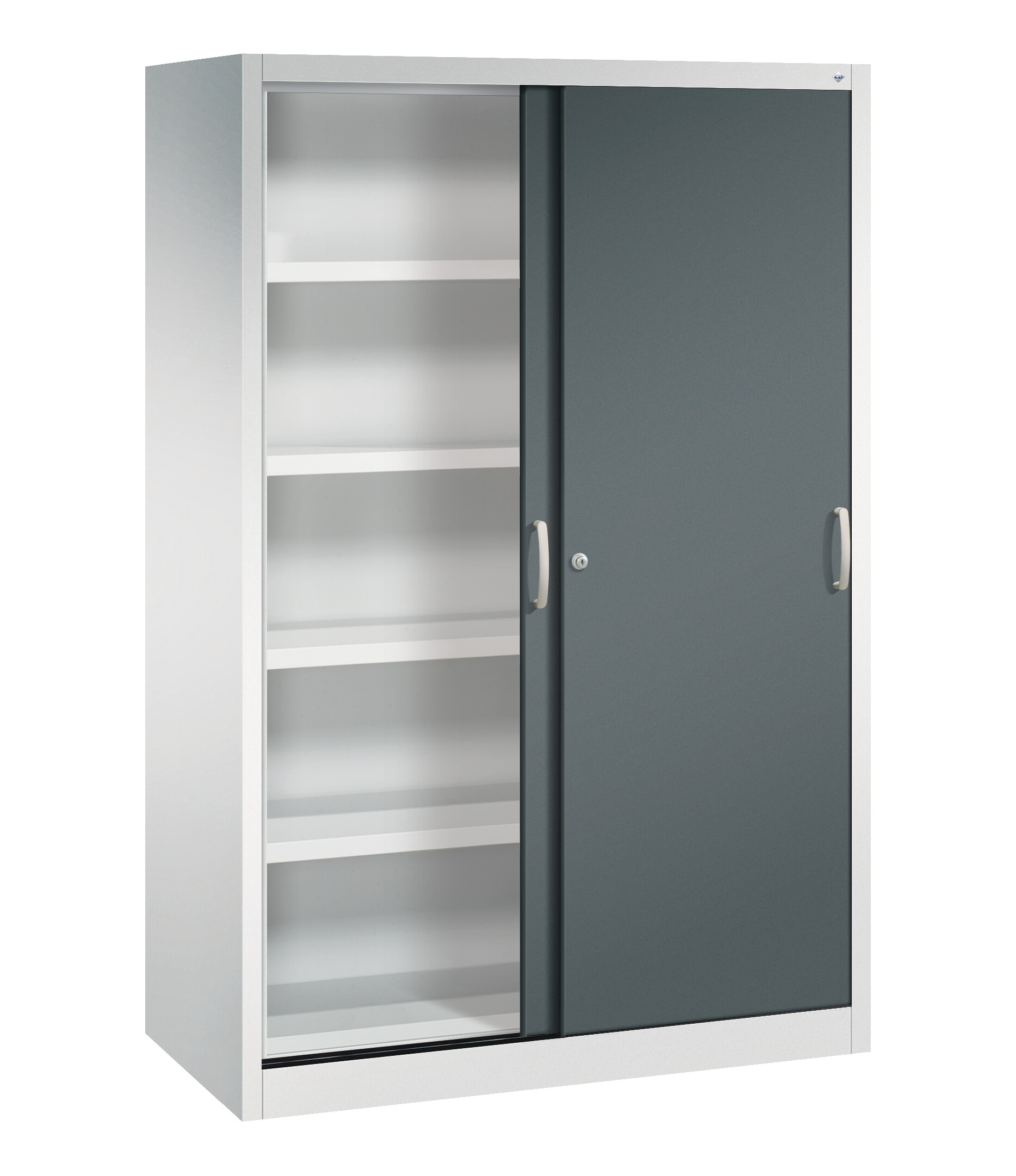 Stahl-Schiebetürenschrank Sport, als Sportgeräteschrank, Korpus aus stabiler Stahlkonstruktion mit hochwertiger Einbrennbeschichtung für hohe UV-Beständigkeit, mit Kunststoffgleitern als praktischer Schrank- und Fußbodenschutz, hohe Flexibilität der Inneneinrichtung durch Höhenverstellbarkeit im 15 mm Raster, Türen verstärkt für hohe Stabilität, leichtgängige Bedienung durch Leichtlaufrollen in spezieller Schienenführung, 2 Ergonomische Bügelgriffe Ergolock aus Metall für einfache Bedienung, matt vernickelt, 4 Einlegeböden aus Stahl, lackiert, mit vorderer Aufkantung als praktische Abrollsicherung und hoher Traglast von 70 kg, 1 Wechselzylinder matt vernickelt mit 2 Schlüsseln, Maße (H x B x T): 1950 x 1200 x 600 mm, Korpus: RAL 7035 Lichtgrau, Türen: RAL 7016 Anthrazitgrau, Inneneinrichtung: RAL 7035 Lichtgrau, Gewicht: 109 kg