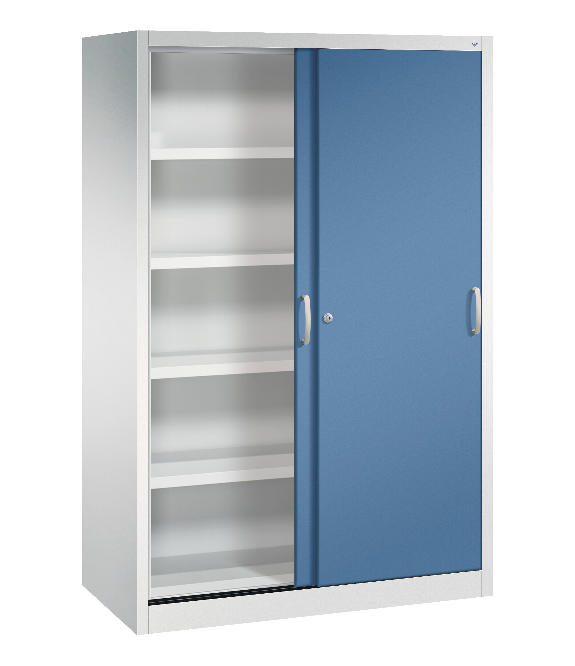 Stahl-Schiebetürenschrank Sport, als Sportgeräteschrank, Korpus aus stabiler Stahlkonstruktion mit hochwertiger Einbrennbeschichtung für hohe UV-Beständigkeit, mit Kunststoffgleitern als praktischer Schrank- und Fußbodenschutz, hohe Flexibilität der Inneneinrichtung durch Höhenverstellbarkeit im 15 mm Raster, Türen verstärkt für hohe Stabilität, leichtgängige Bedienung durch Leichtlaufrollen in spezieller Schienenführung, 2 Ergonomische Bügelgriffe Ergolock aus Metall für einfache Bedienung, matt vernickelt, 4 Einlegeböden aus Stahl, lackiert, mit vorderer Aufkantung als praktische Abrollsicherung und hoher Traglast von 70 kg, 1 Wechselzylinder matt vernickelt mit 2 Schlüsseln, Maße (H x B x T): 1950 x 1200 x 600 mm, Korpus: RAL 7035 Lichtgrau, Türen: RAL 5012 Lichtblau, Inneneinrichtung: RAL 7035 Lichtgrau, Gewicht: 109 kgProduktvorteile:Hohe Flexibilität der Inneneinrichtung durch Verstellbarkeit im 15-mm-RasterHohe Traglast des Einlegebodens von 70 kg für flexible NutzungAbrollsicher durch vordere AufkantungSchiebetüren mit langlebigen Leichtlaufrollen für beste Laufeigenschaften und komfortable BedienungAusführung mit Schiebetüren für reduzierten Flächenbedarf des Schrankes