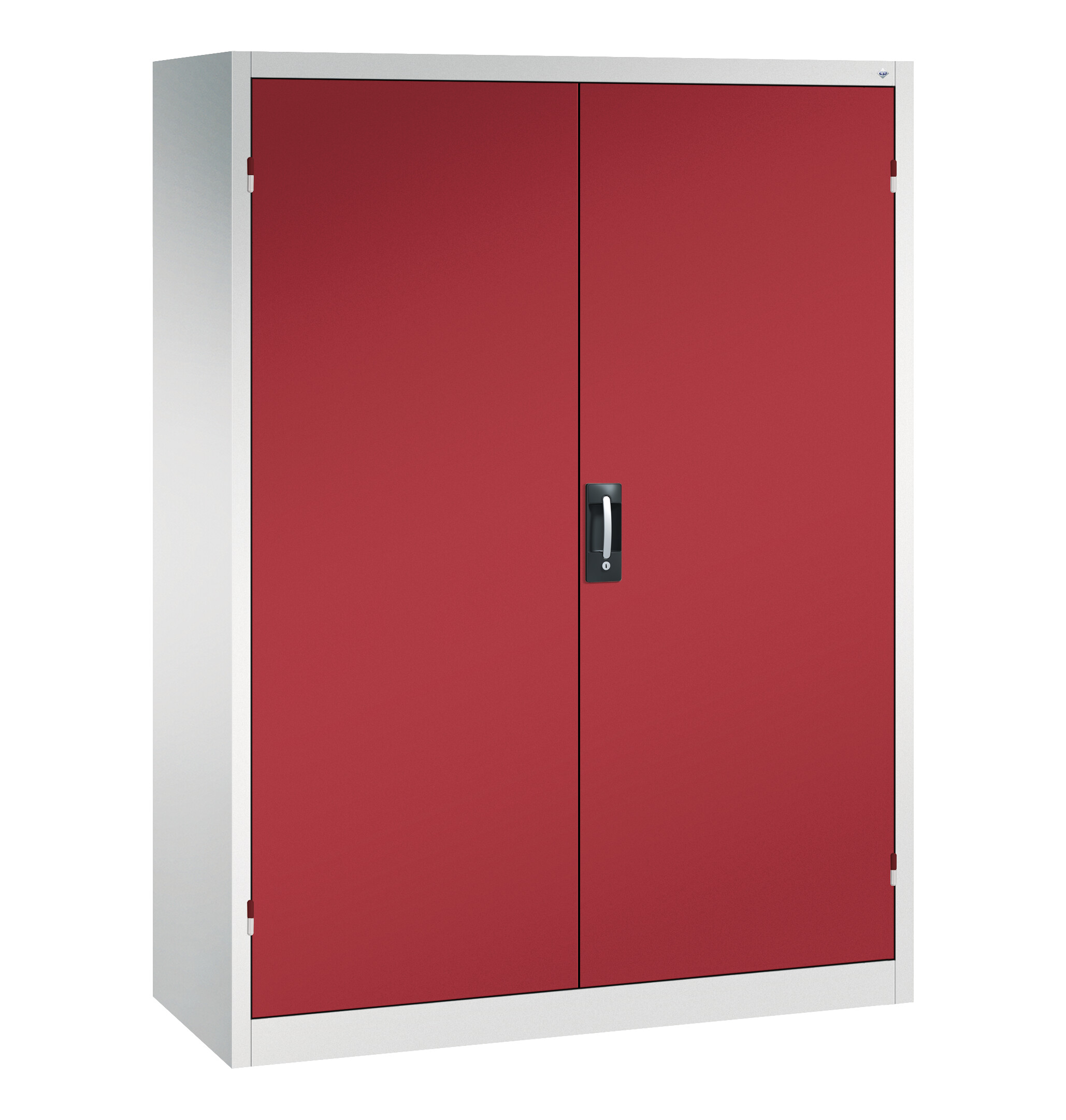 Stahl-Flügeltürenschrank Sport, als Sportgeräteschrank, Korpus aus stabiler Stahlkonstruktion mit hochwertiger Einbrennbeschichtung für hohe UV-Beständigkeit, mit Kunststoffgleitern als praktischer Schrank- und Fußbodenschutz, hohe Flexibilität der Inneneinrichtung durch Höhenverstellbarkeit im 15 mm Raster, Türen verstärkt für hohe Stabilität, verdeckte Schließstangen, Türaufhängung oben und unten in außen liegenden Scharnieren mit großzügigem Öffnungswinkel ca. 180 Grad, zueinanderschlagend für gemeinsamen Verschluss, Tür verstärkt für hohe Stabilität, Türaufhängung in außen liegenden Scharnieren mit großzügigem Öffnungswinkel ca. 180 Grad, 4 Einlegeböden aus Stahl, lackiert, mit vorderer Aufkantung als praktische Abrollsicherung, 1 fach verstärkt mit hoher Traglast von 90 kg, 1 Ergonomischer Muldengriff Ergo-Lock 4.0 für optimale Bedienungssicherheit und Verschleißfestigkeit, 3-Riegel-Verschluss, mit Zylinderschloss und 2 Schlüsseln, Maße (H x B x T): 1950 x 1500 x 500 mm, Korpus: RAL 7035 Lichtgrau, Türen: RAL 3003 Rubinrot, Inneneinrichtung: RAL 7035 Lichtgrau, Gewicht: 104 kg