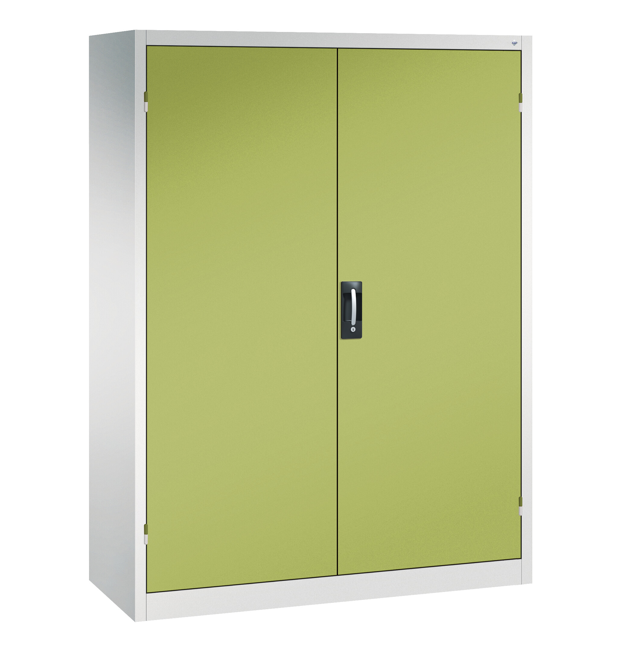 Stahl-Flügeltürenschrank Sport, als Sportgeräteschrank, Korpus aus stabiler Stahlkonstruktion mit hochwertiger Einbrennbeschichtung für hohe UV-Beständigkeit, mit Kunststoffgleitern als praktischer Schrank- und Fußbodenschutz, hohe Flexibilität der Inneneinrichtung durch Höhenverstellbarkeit im 15 mm Raster, Türen verstärkt für hohe Stabilität, verdeckte Schließstangen, Türaufhängung oben und unten in außen liegenden Scharnieren mit großzügigem Öffnungswinkel ca. 180 Grad, zueinanderschlagend für gemeinsamen Verschluss, Tür verstärkt für hohe Stabilität, Türaufhängung in außen liegenden Scharnieren mit großzügigem Öffnungswinkel ca. 180 Grad, 4 Einlegeböden aus Stahl, lackiert, mit vorderer Aufkantung als praktische Abrollsicherung, 1 fach verstärkt mit hoher Traglast von 90 kg, 1 Ergonomischer Muldengriff Ergo-Lock 4.0 für optimale Bedienungssicherheit und Verschleißfestigkeit, 3-Riegel-Verschluss, mit Zylinderschloss und 2 Schlüsseln, Maße (H x B x T): 1950 x 1500 x 500 mm, Korpus: RAL 7035 Lichtgrau, Türen: 1108060 RDS Clowngrün, Inneneinrichtung: RAL 7035 Lichtgrau, Gewicht: 104 kg