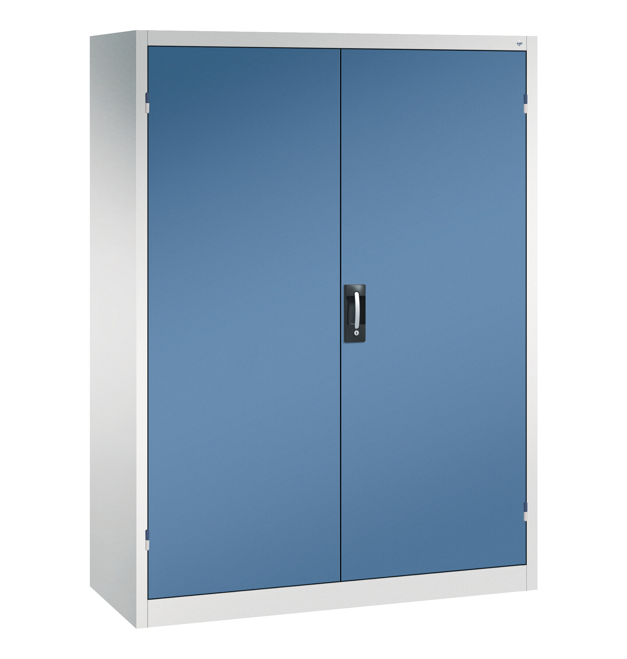 Stahl-Flügeltürenschrank Sport, als Sportgeräteschrank, Korpus aus stabiler Stahlkonstruktion mit hochwertiger Einbrennbeschichtung für hohe UV-Beständigkeit, mit Kunststoffgleitern als praktischer Schrank- und Fußbodenschutz, hohe Flexibilität der Inneneinrichtung durch Höhenverstellbarkeit im 15 mm Raster, Türen verstärkt für hohe Stabilität, verdeckte Schließstangen, Türaufhängung oben und unten in außen liegenden Scharnieren mit großzügigem Öffnungswinkel ca. 180 Grad, zueinanderschlagend für gemeinsamen Verschluss, Tür verstärkt für hohe Stabilität, Türaufhängung in außen liegenden Scharnieren mit großzügigem Öffnungswinkel ca. 180 Grad, 4 Einlegeböden aus Stahl, lackiert, mit vorderer Aufkantung als praktische Abrollsicherung, 1 fach verstärkt mit hoher Traglast von 90 kg, 1 Ergonomischer Muldengriff Ergo-Lock 4.0 für optimale Bedienungssicherheit und Verschleißfestigkeit, 3-Riegel-Verschluss, mit Zylinderschloss und 2 Schlüsseln, Maße (H x B x T): 1950 x 1500 x 500 mm, Korpus: RAL 7035 Lichtgrau, Türen: RAL 5023 Fernblau, Inneneinrichtung: RAL 7035 Lichtgrau, Gewicht: 104 kg