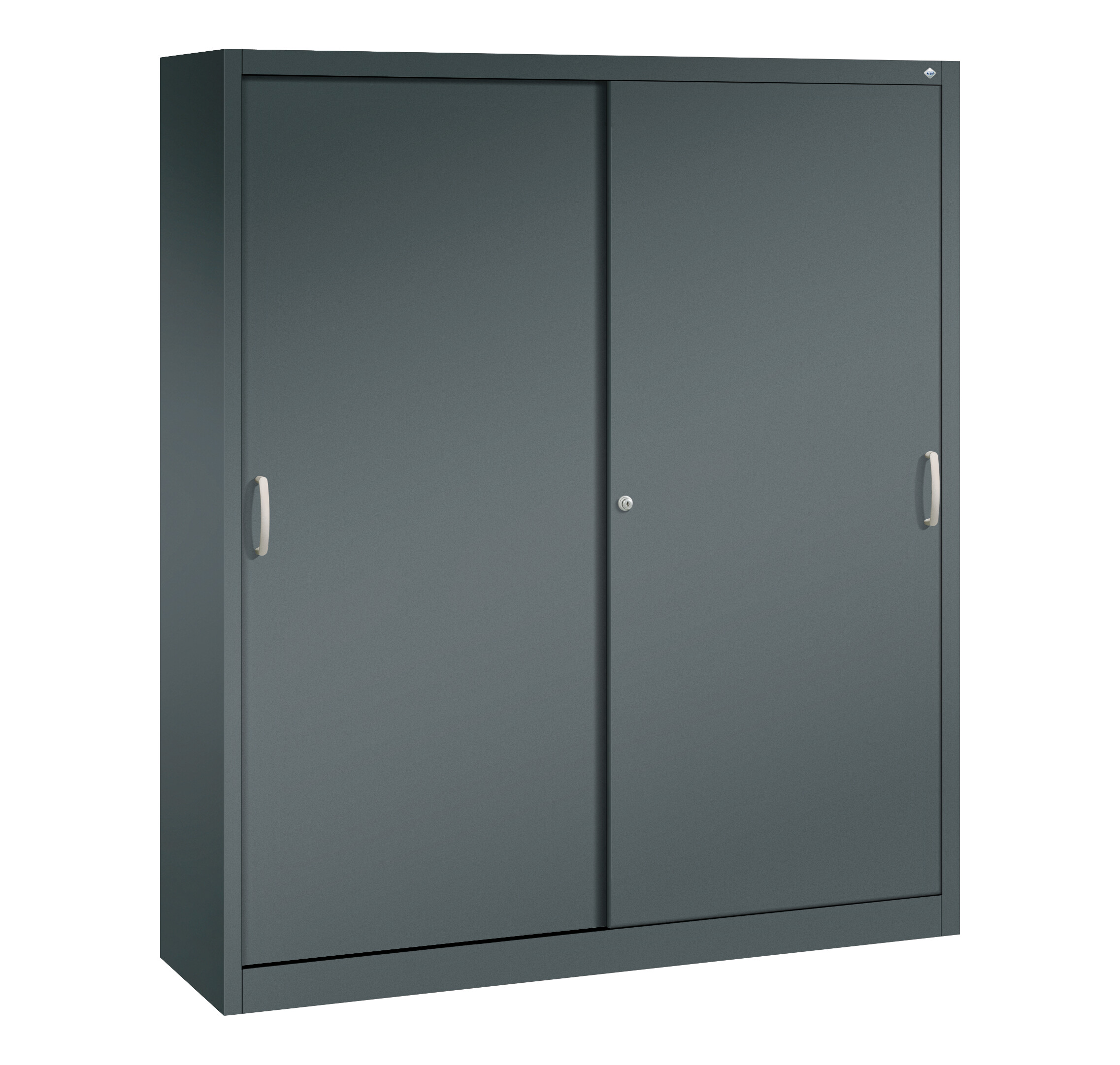 Stahl-Schiebetürenschrank Sport, als Sportgeräteschrank, Korpus aus stabiler Stahlkonstruktion mit hochwertiger Einbrennbeschichtung für hohe UV-Beständigkeit, mit Kunststoffgleitern als praktischer Schrank- und Fußbodenschutz, hohe Flexibilität der Inneneinrichtung durch Höhenverstellbarkeit im 15 mm Raster, Türen verstärkt für hohe Stabilität, leichtgängige Bedienung durch Leichtlaufrollen in spezieller Schienenführung, mit Mitteltrennwand, 2 Ergonomische Bügelgriffe Ergolock aus Metall für einfache Bedienung, matt vernickelt, 8 Einlegeböden aus Stahl, lackiert, mit vorderer Aufkantung als praktische Abrollsicherung, mit hoher Traglast von 70 kg, 1 Wechselzylinder matt vernickelt mit 2 Schlüsseln, Maße (H x B x T): 1950 x 1600 x 400 mm, Korpus: RAL 7016 Anthrazitgrau, Türen: RAL 7016 Anthrazitgrau, Inneneinrichtung: RAL 7035 Lichtgrau, Gewicht: 108 kg