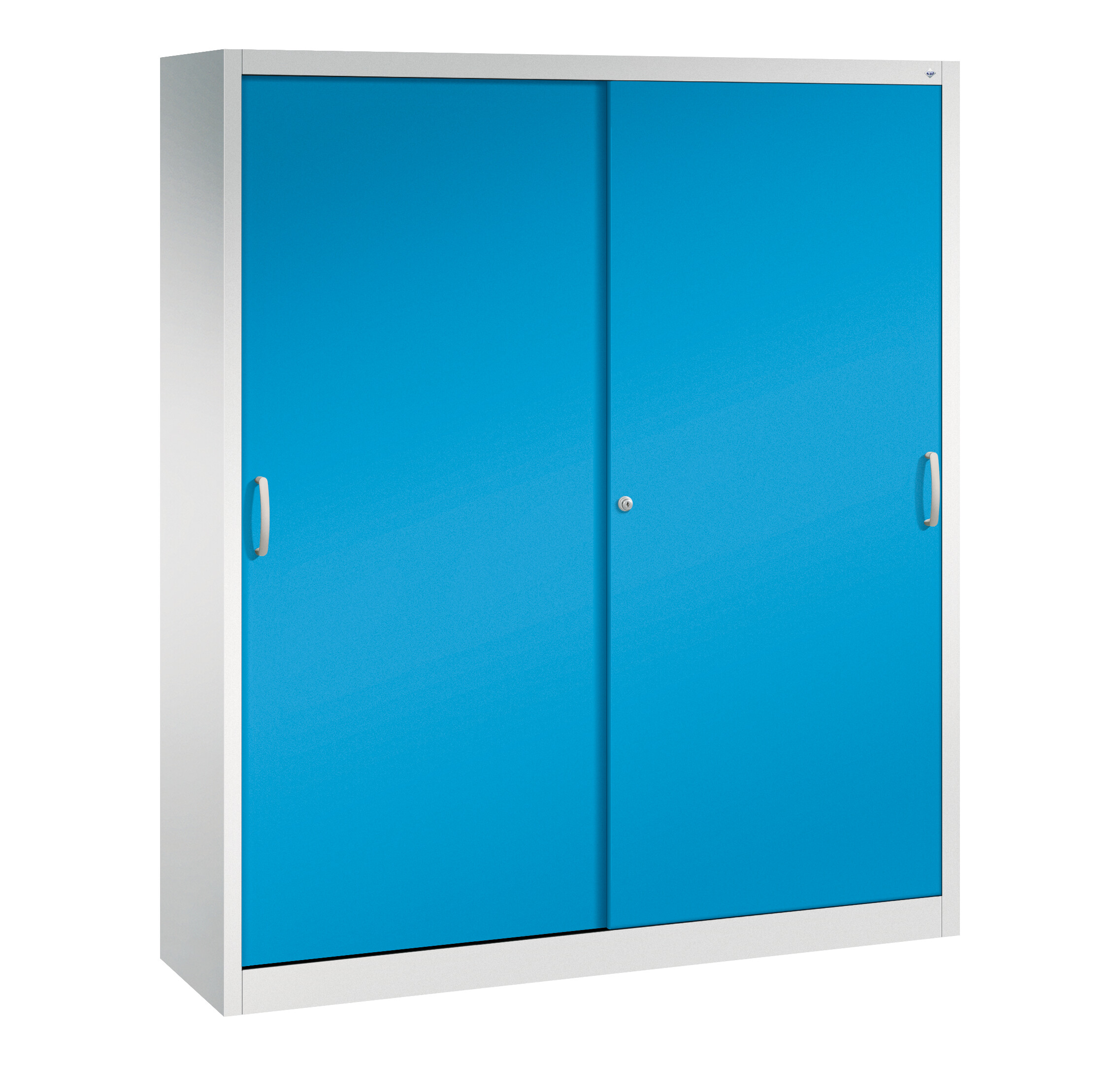 Stahl-Schiebetürenschrank Sport, als Sportgeräteschrank, Korpus aus stabiler Stahlkonstruktion mit hochwertiger Einbrennbeschichtung für hohe UV-Beständigkeit, mit Kunststoffgleitern als praktischer Schrank- und Fußbodenschutz, hohe Flexibilität der Inneneinrichtung durch Höhenverstellbarkeit im 15 mm Raster, Türen verstärkt für hohe Stabilität, leichtgängige Bedienung durch Leichtlaufrollen in spezieller Schienenführung, mit Mitteltrennwand, 2 Ergonomische Bügelgriffe Ergolock aus Metall für einfache Bedienung, matt vernickelt, 8 Einlegeböden aus Stahl, lackiert, mit vorderer Aufkantung als praktische Abrollsicherung, mit hoher Traglast von 70 kg, 1 Wechselzylinder matt vernickelt mit 2 Schlüsseln, Maße (H x B x T): 1950 x 1600 x 400 mm, Korpus: RAL 7035 Lichtgrau, Türen: RAL 5012 Lichtblau, Inneneinrichtung: RAL 7035 Lichtgrau, Gewicht: 108 kg