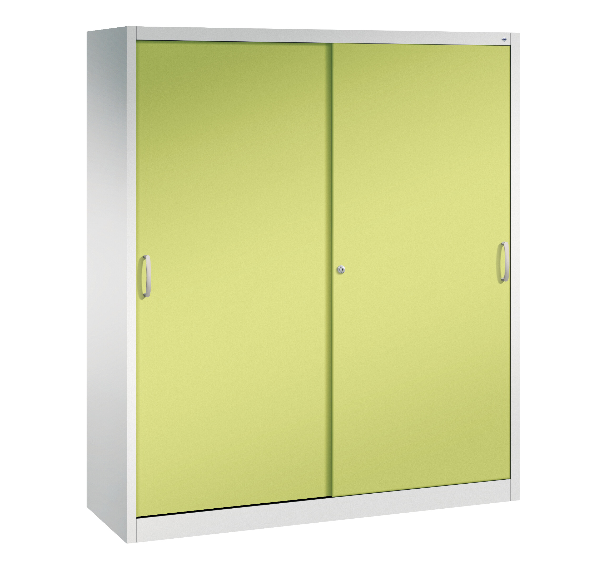 Stahl-Schiebetürenschrank Sport, als Sportgeräteschrank, Korpus aus stabiler Stahlkonstruktion mit hochwertiger Einbrennbeschichtung für hohe UV-Beständigkeit, mit Kunststoffgleitern als praktischer Schrank- und Fußbodenschutz, hohe Flexibilität der Inneneinrichtung durch Höhenverstellbarkeit im 15 mm Raster, Türen verstärkt für hohe Stabilität, leichtgängige Bedienung durch Leichtlaufrollen in spezieller Schienenführung, mit Mitteltrennwand, 2 Ergonomische Bügelgriffe Ergolock aus Metall für einfache Bedienung, matt vernickelt, 8 Einlegeböden aus Stahl, lackiert, mit vorderer Aufkantung als praktische Abrollsicherung, mit hoher Traglast von 70 kg, 1 Wechselzylinder matt vernickelt mit 2 Schlüsseln, Maße (H x B x T): 1950 x 1600 x 500 mm, Korpus: RAL 7035 Lichtgrau, Türen: 1108060 RDS Clowngrün, Inneneinrichtung: RAL 7035 Lichtgrau, Gewicht: 118 kg