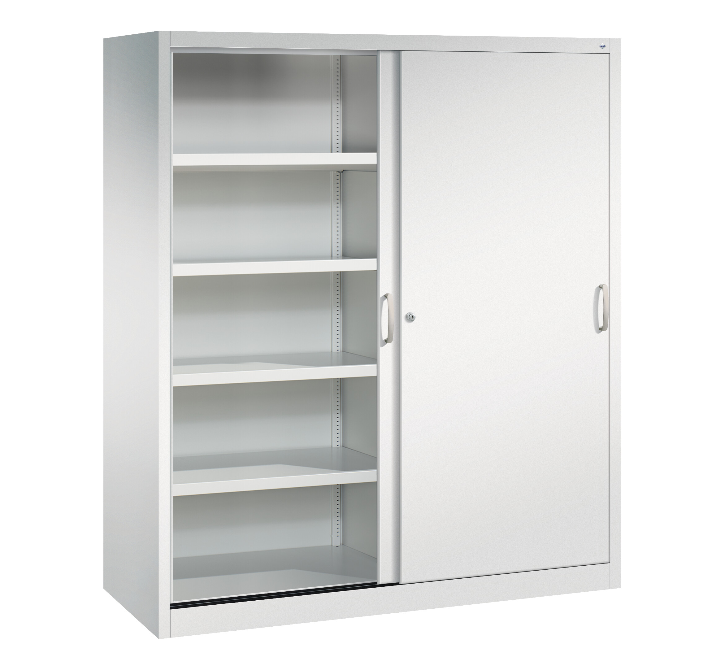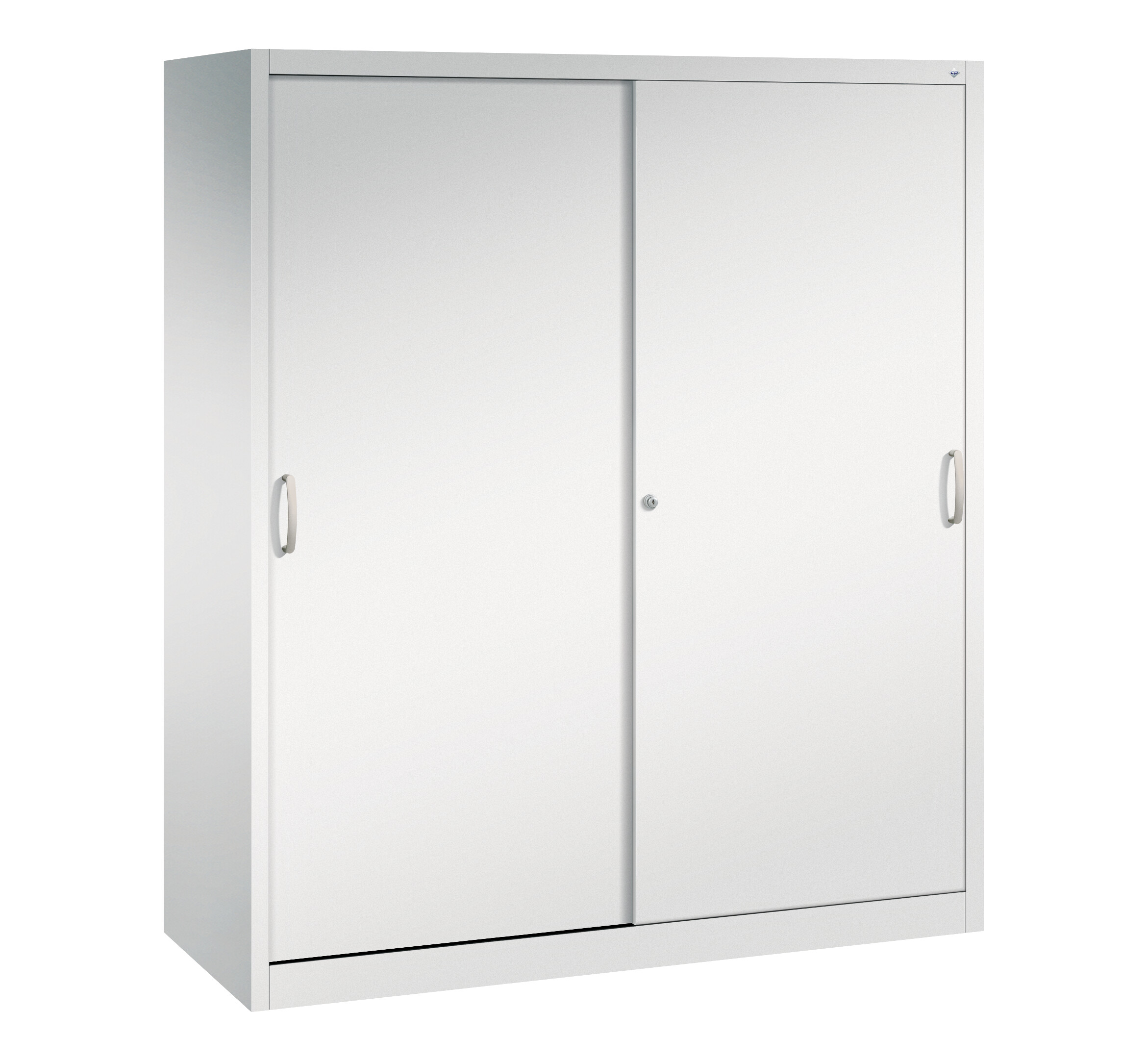 Stahl-Schiebetürenschrank Sport, als Sportgeräteschrank, Korpus aus stabiler Stahlkonstruktion mit hochwertiger Einbrennbeschichtung für hohe UV-Beständigkeit, mit Kunststoffgleitern als praktischer Schrank- und Fußbodenschutz, hohe Flexibilität der Inneneinrichtung durch Höhenverstellbarkeit im 15 mm Raster, Türen verstärkt für hohe Stabilität, leichtgängige Bedienung durch Leichtlaufrollen in spezieller Schienenführung, mit Mitteltrennwand, 2 Ergonomische Bügelgriffe Ergolock aus Metall für einfache Bedienung, matt vernickelt, 8 Einlegeböden aus Stahl, lackiert, mit vorderer Aufkantung als praktische Abrollsicherung, mit hoher Traglast von 70 kg, 1 Wechselzylinder matt vernickelt mit 2 Schlüsseln, Maße (H x B x T): 1950 x 1600 x 600 mm, Korpus: RAL 7035 Lichtgrau, Türen: RAL 7035 Lichtgrau, Inneneinrichtung: RAL 7035 Lichtgrau, Gewicht: 133 kg