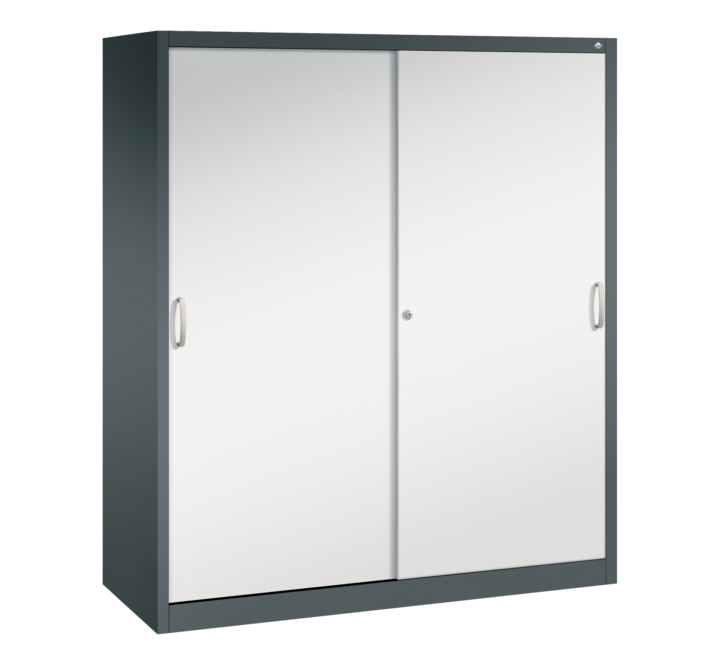 Stahl-Schiebetürenschrank Sport, als Sportgeräteschrank, Korpus aus stabiler Stahlkonstruktion mit hochwertiger Einbrennbeschichtung für hohe UV-Beständigkeit, mit Kunststoffgleitern als praktischer Schrank- und Fußbodenschutz, hohe Flexibilität der Inneneinrichtung durch Höhenverstellbarkeit im 15 mm Raster, Türen verstärkt für hohe Stabilität, leichtgängige Bedienung durch Leichtlaufrollen in spezieller Schienenführung, mit Mitteltrennwand, 2 Ergonomische Bügelgriffe Ergolock aus Metall für einfache Bedienung, matt vernickelt, 8 Einlegeböden aus Stahl, lackiert, mit vorderer Aufkantung als praktische Abrollsicherung, mit hoher Traglast von 70 kg, 1 Wechselzylinder matt vernickelt mit 2 Schlüsseln, Maße (H x B x T): 1950 x 1600 x 600 mm, Korpus: RAL 7016 Anthrazitgrau, Türen: RAL 7035 Lichtgrau, Inneneinrichtung: RAL 7035 Lichtgrau, Gewicht: 133 kg