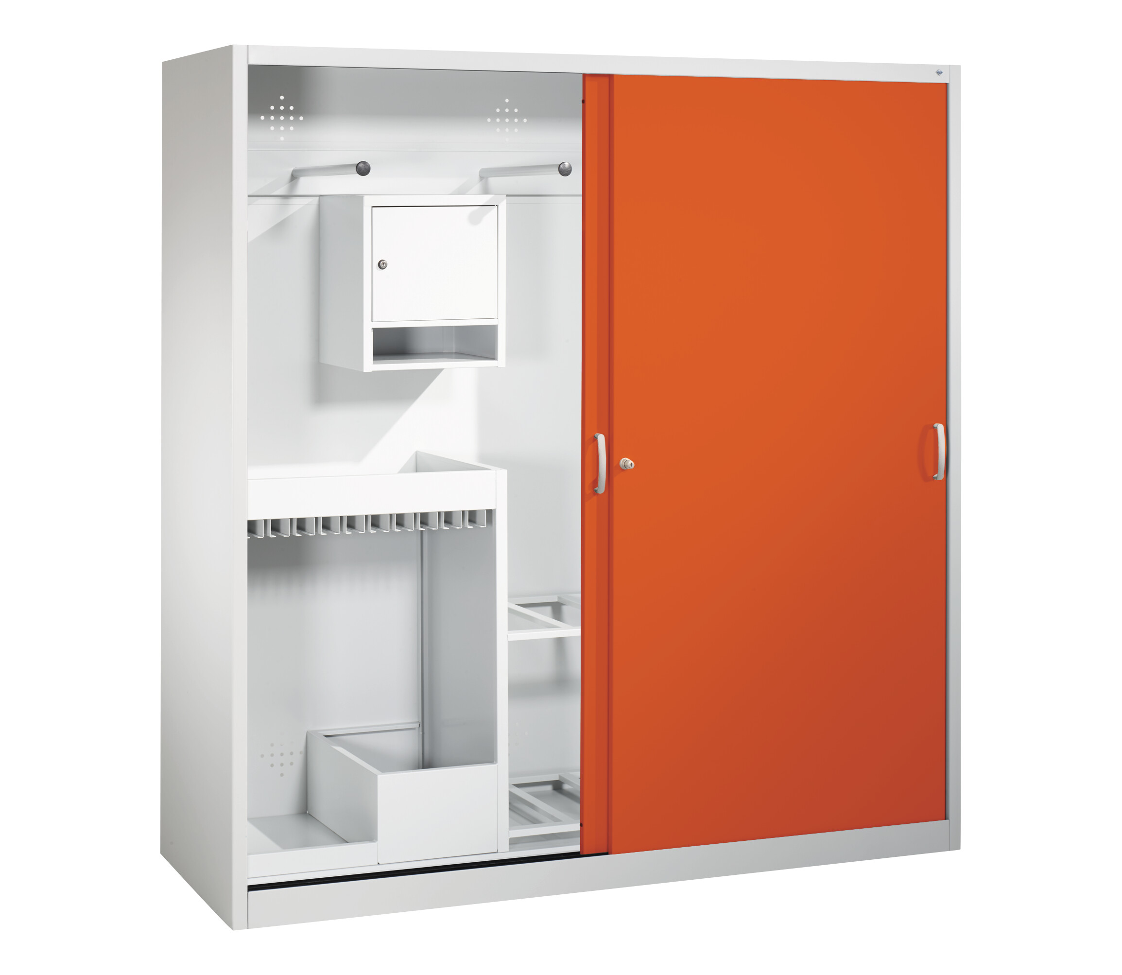 Stahl-Schiebetürenschrank Sport, als Sportgeräteschrank, Korpus aus stabiler Stahlkonstruktion mit hochwertiger Einbrennbeschichtung für hohe UV-Beständigkeit, mit Kunststoffgleitern als praktischer Schrank- und Fußbodenschutz, hohe Flexibilität der Inneneinrichtung durch Höhenverstellbarkeit im 15 mm Raster, Türen verstärkt für hohe Stabilität, leichtgängige Bedienung durch Leichtlaufrollen in spezieller Schienenführung, mit Mitteltrennwand, rechte Seite Einlegeböden, linke Seite oben mittig Rückwandtraverse mit Reifenhalter, darunter Wertfach mit Zylinderschloss sowie offener Ablage, Seitenwandtraverse mit 3 Haken z.B. als Seilhalter, unten rechts Gymnastikstangenhalter mit Trennstegen, links Modulkasten mit Ablagewannen und Turnkeulenhalter, Ergonomischer Bügelgriff Ergolock aus Metall für einfache Bedienung, matt vernickelt, 5 Einlegeböden aus Stahl, lackiert, mit hoher Traglast von 110 kg, 1 Wechselzylinder matt vernickelt mit 2 Schlüsseln, Maße (H x B x T): 1950 x 1900 x 600 mm, Korpus: RAL 7035 Lichtgrau, Türen: RAL 2004 Reinorange, Inneneinrichtung: RAL 7035 Lichtgrau, Gewicht: 160 kg