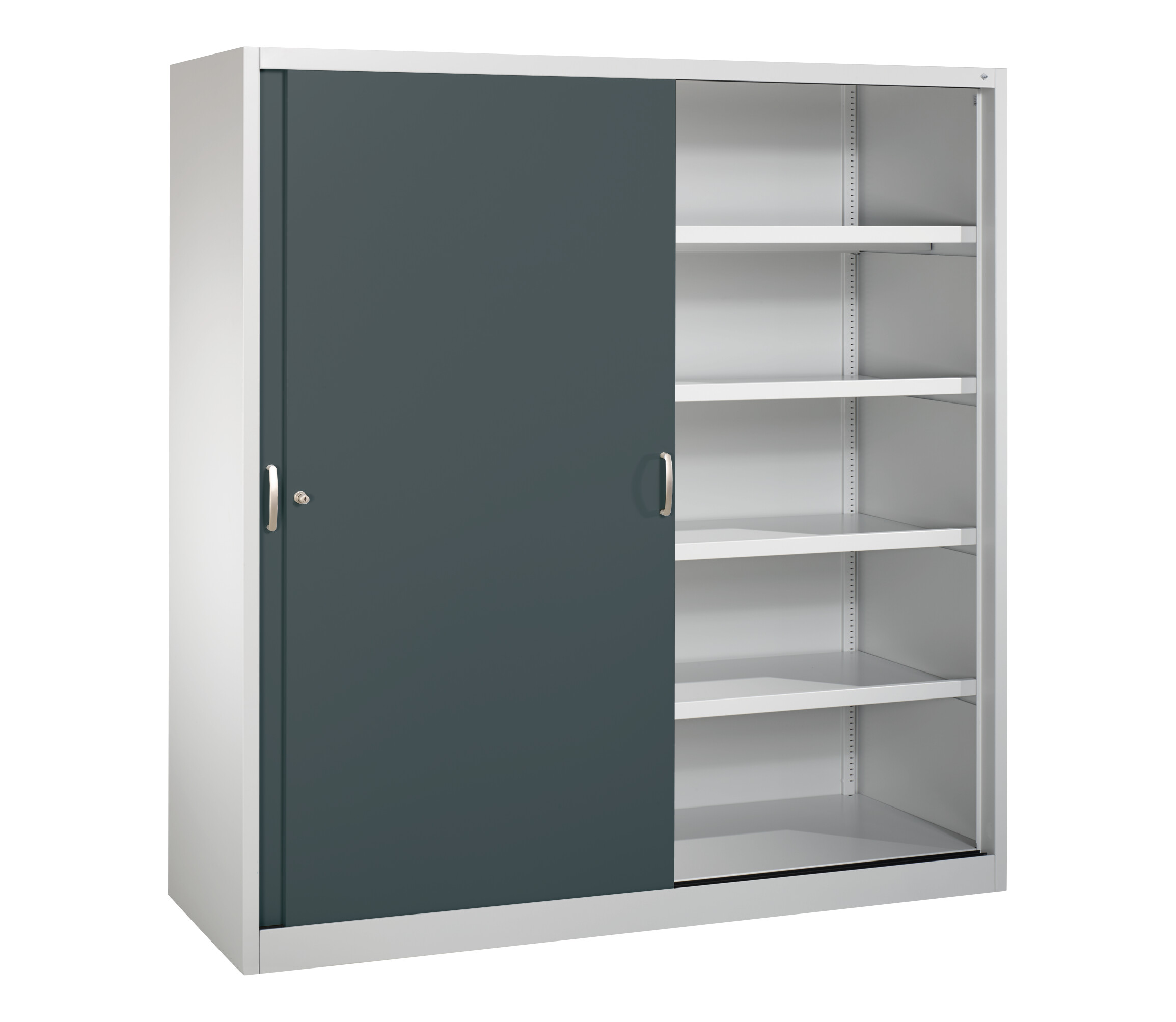 Stahl-Schiebetürenschrank Sport, als Sportgeräteschrank, Korpus aus stabiler Stahlkonstruktion mit hochwertiger Einbrennbeschichtung für hohe UV-Beständigkeit, mit Kunststoffgleitern als praktischer Schrank- und Fußbodenschutz, hohe Flexibilität der Inneneinrichtung durch Höhenverstellbarkeit im 15 mm Raster, Türen verstärkt für hohe Stabilität, leichtgängige Bedienung durch Leichtlaufrollen in spezieller Schienenführung, Ergonomischer Bügelgriff Ergolock aus Metall für einfache Bedienung, matt vernickelt, 4 Einlegeböden aus Stahl, lackiert, mit vorderer Aufkantung als praktische Abrollsicherung, 1 fach verstärkt mit hoher mit hoher Traglast von 90 kg, 1 Wechselzylinder matt vernickelt mit 2 Schlüsseln, Maße (H x B x T): 1950 x 1900 x 600 mm, Korpus: RAL 7035 Lichtgrau, Türen: RAL 7016 Anthrazitgrau, Inneneinrichtung: RAL 7035 Lichtgrau, Gewicht: 178 kg