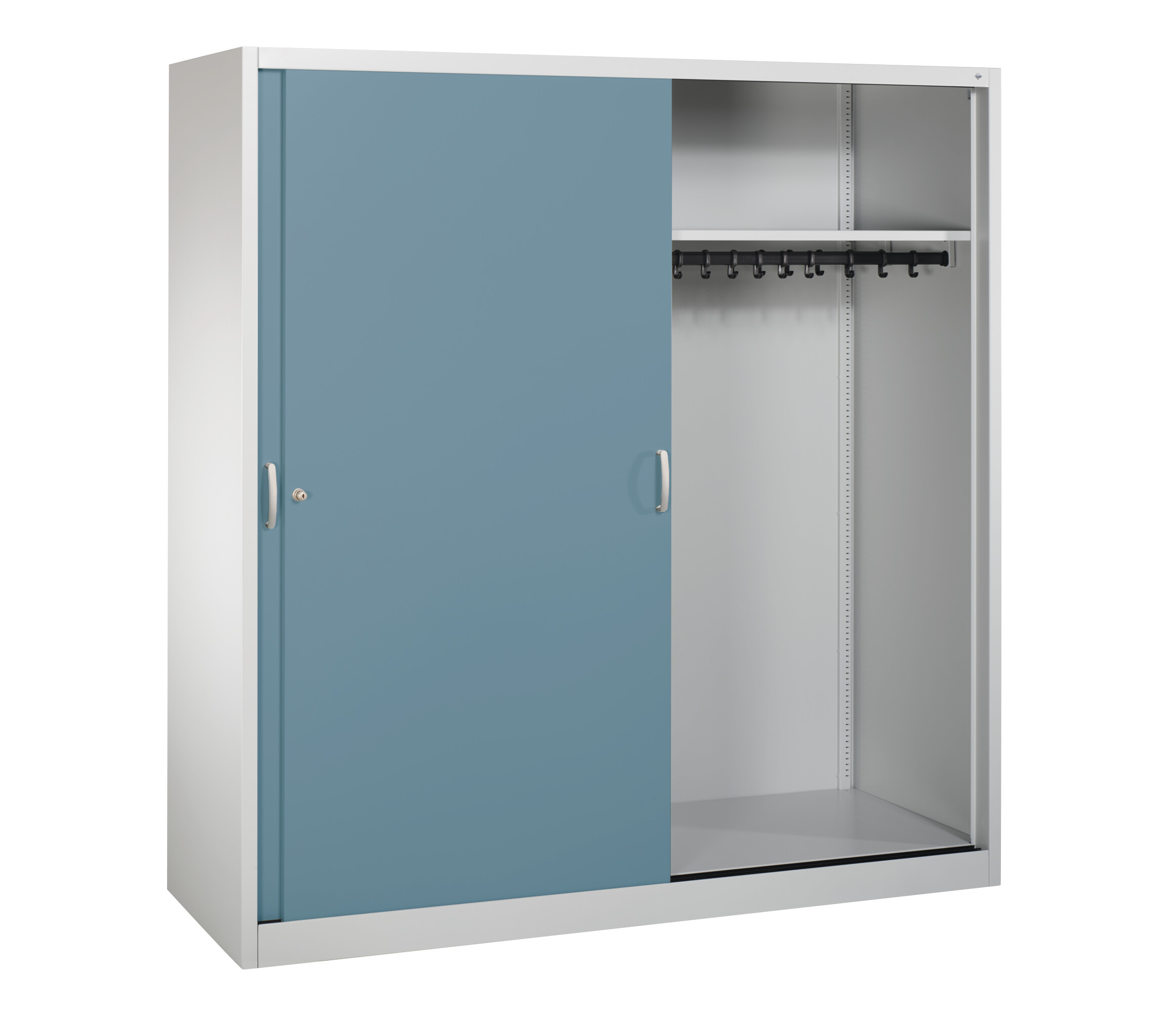 Stahl-Schiebetürenschrank Sport, als Sportgeräteschrank, Korpus aus stabiler Stahlkonstruktion mit hochwertiger Einbrennbeschichtung für hohe UV-Beständigkeit, mit Kunststoffgleitern als praktischer Schrank- und Fußbodenschutz, hohe Flexibilität der Inneneinrichtung durch Höhenverstellbarkeit im 15 mm Raster, Türen verstärkt für hohe Stabilität, leichtgängige Bedienung durch Leichtlaufrollen in spezieller Schienenführung, mit Mitteltrennwand, Ergonomischer Bügelgriff Ergolock aus Metall für einfache Bedienung, matt vernickelt, 2 Ablageböden aus Stahl, lackiert, mit 2 hintereinander liegenden Garderobenstangen und 20 Schiebehaken, 1 Wechselzylinder matt vernickelt mit 2 Schlüsseln, Maße (H x B x T): 1950 x 1900 x 600 mm, Korpus: RAL 7035 Lichtgrau, Türen: 2406015 RDS Architekturblau, Inneneinrichtung: RAL 7035 Lichtgrau, Gewicht: 125 kg