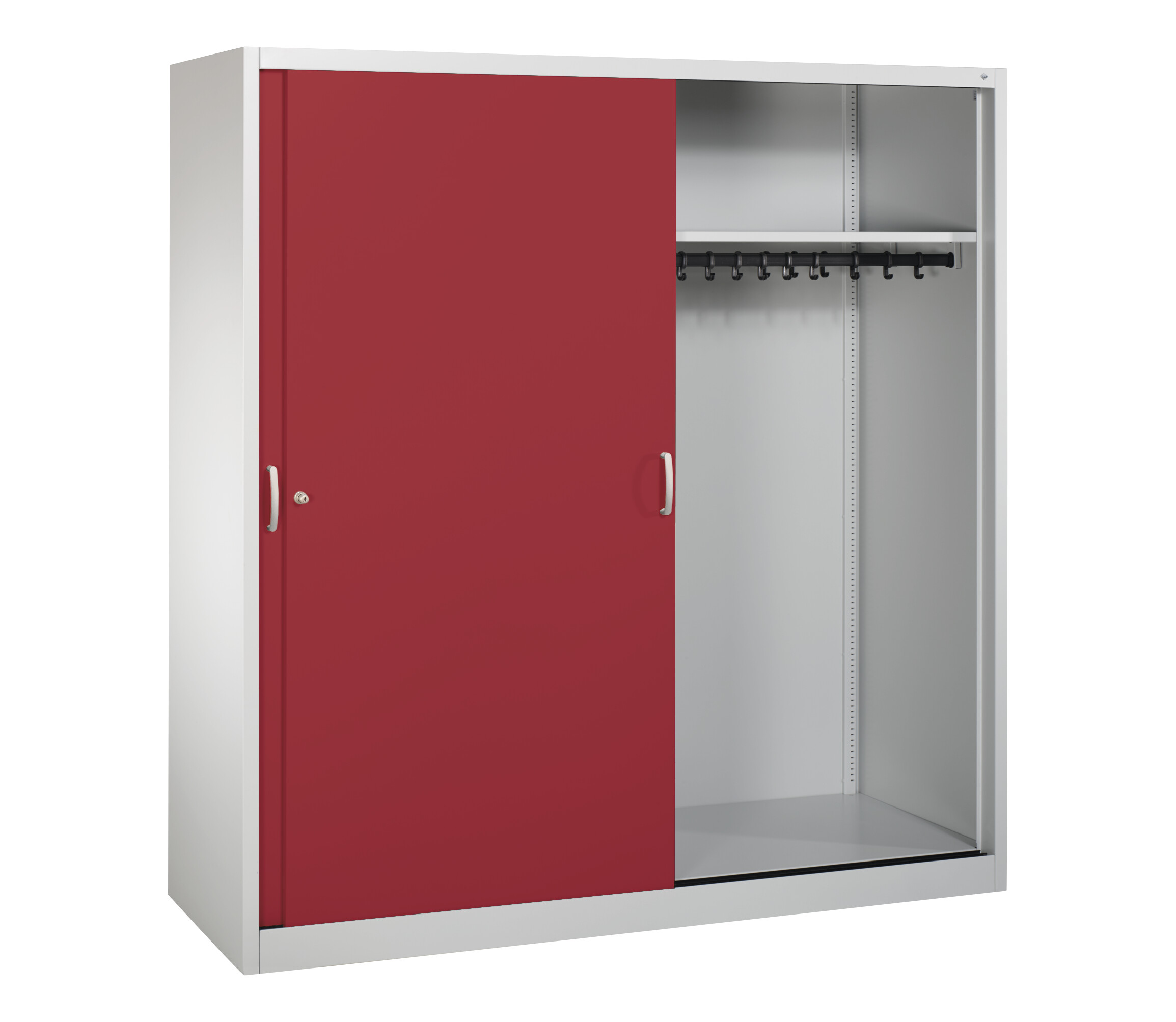 Stahl-Schiebetürenschrank Sport, als Sportgeräteschrank, Korpus aus stabiler Stahlkonstruktion mit hochwertiger Einbrennbeschichtung für hohe UV-Beständigkeit, mit Kunststoffgleitern als praktischer Schrank- und Fußbodenschutz, hohe Flexibilität der Inneneinrichtung durch Höhenverstellbarkeit im 15 mm Raster, Türen verstärkt für hohe Stabilität, leichtgängige Bedienung durch Leichtlaufrollen in spezieller Schienenführung, mit Mitteltrennwand, Ergonomischer Bügelgriff Ergolock aus Metall für einfache Bedienung, matt vernickelt, 2 Ablageböden aus Stahl, lackiert, mit 2 hintereinander liegenden Garderobenstangen und 20 Schiebehaken, 1 Wechselzylinder matt vernickelt mit 2 Schlüsseln, Maße (H x B x T): 1950 x 1900 x 600 mm, Korpus: RAL 7035 Lichtgrau, Türen: RAL 3003 Rubinrot, Inneneinrichtung: RAL 7035 Lichtgrau, Gewicht: 125 kg
