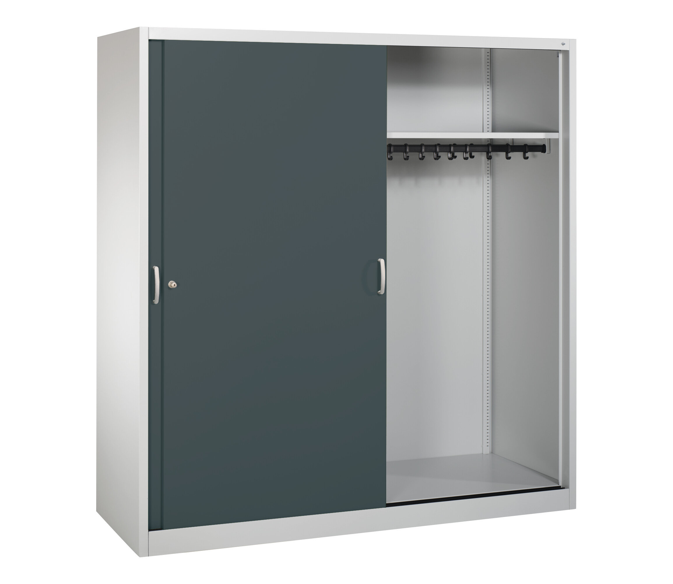 Stahl-Schiebetürenschrank Sport, als Sportgeräteschrank, Korpus aus stabiler Stahlkonstruktion mit hochwertiger Einbrennbeschichtung für hohe UV-Beständigkeit, mit Kunststoffgleitern als praktischer Schrank- und Fußbodenschutz, hohe Flexibilität der Inneneinrichtung durch Höhenverstellbarkeit im 15 mm Raster, Türen verstärkt für hohe Stabilität, leichtgängige Bedienung durch Leichtlaufrollen in spezieller Schienenführung, mit Mitteltrennwand, Ergonomischer Bügelgriff Ergolock aus Metall für einfache Bedienung, matt vernickelt, 2 Ablageböden aus Stahl, lackiert, mit 2 hintereinander liegenden Garderobenstangen und 20 Schiebehaken, 1 Wechselzylinder matt vernickelt mit 2 Schlüsseln, Maße (H x B x T): 1950 x 1900 x 600 mm, Korpus: RAL 7035 Lichtgrau, Türen: RAL 7016 Anthrazitgrau, Inneneinrichtung: RAL 7035 Lichtgrau, Gewicht: 125 kg