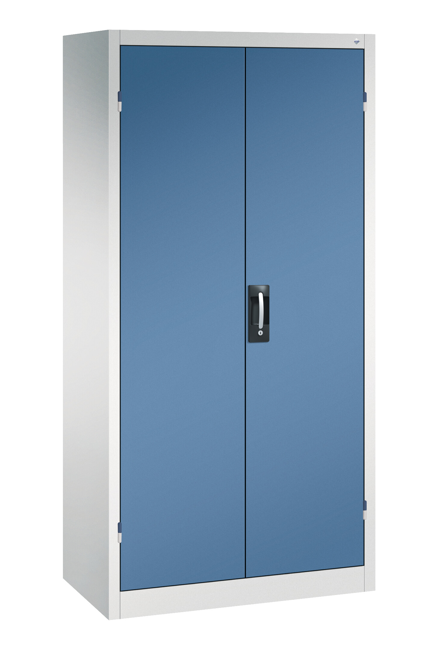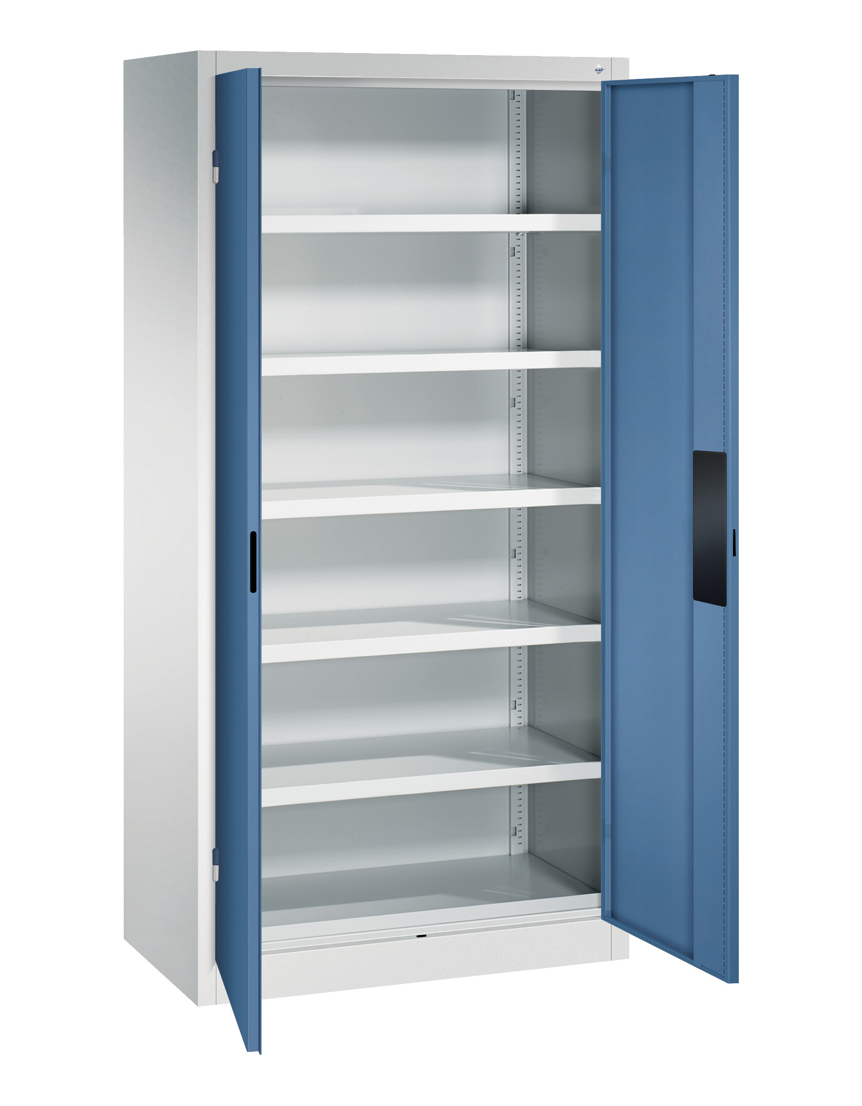 Stahl-Flügeltürenschrank Sport, als Sportgeräteschrank, Korpus aus stabiler Stahlkonstruktion mit hochwertiger Einbrennbeschichtung für hohe UV-Beständigkeit, mit Kunststoffgleitern als praktischer Schrank- und Fußbodenschutz, hohe Flexibilität der Inneneinrichtung durch Höhenverstellbarkeit im 15 mm Raster, Türen verstärkt für hohe Stabilität, Türaufhängung oben und unten in außen liegenden Scharnieren mit großzügigem Öffnungswinkel ca. 180 Grad, zueinanderschlagend für gemeinsamen Verschluss, Tür verstärkt für hohe Stabilität, Türaufhängung in außen liegenden Scharnieren mit großzügigem Öffnungswinkel ca. 180 Grad, 5 Einlegeböden aus Stahl lackiert, mit hoher Traglast von 70 kg, 1 Ergonomischer Muldengriff Ergo-Lock 4.0 für optimale Bedienungssicherheit und Verschleißfestigkeit, 3-Riegel-Verschluss, mit Zylinderschloss und 2 Schlüsseln, Maße (H x B x T): 1950 x 930 x 500 mm, Korpus: RAL 7035 Lichtgrau, Türen: RAL 5023 Fernblau, Inneneinrichtung: RAL 7035 Lichtgrau, Gewicht: 73 kg