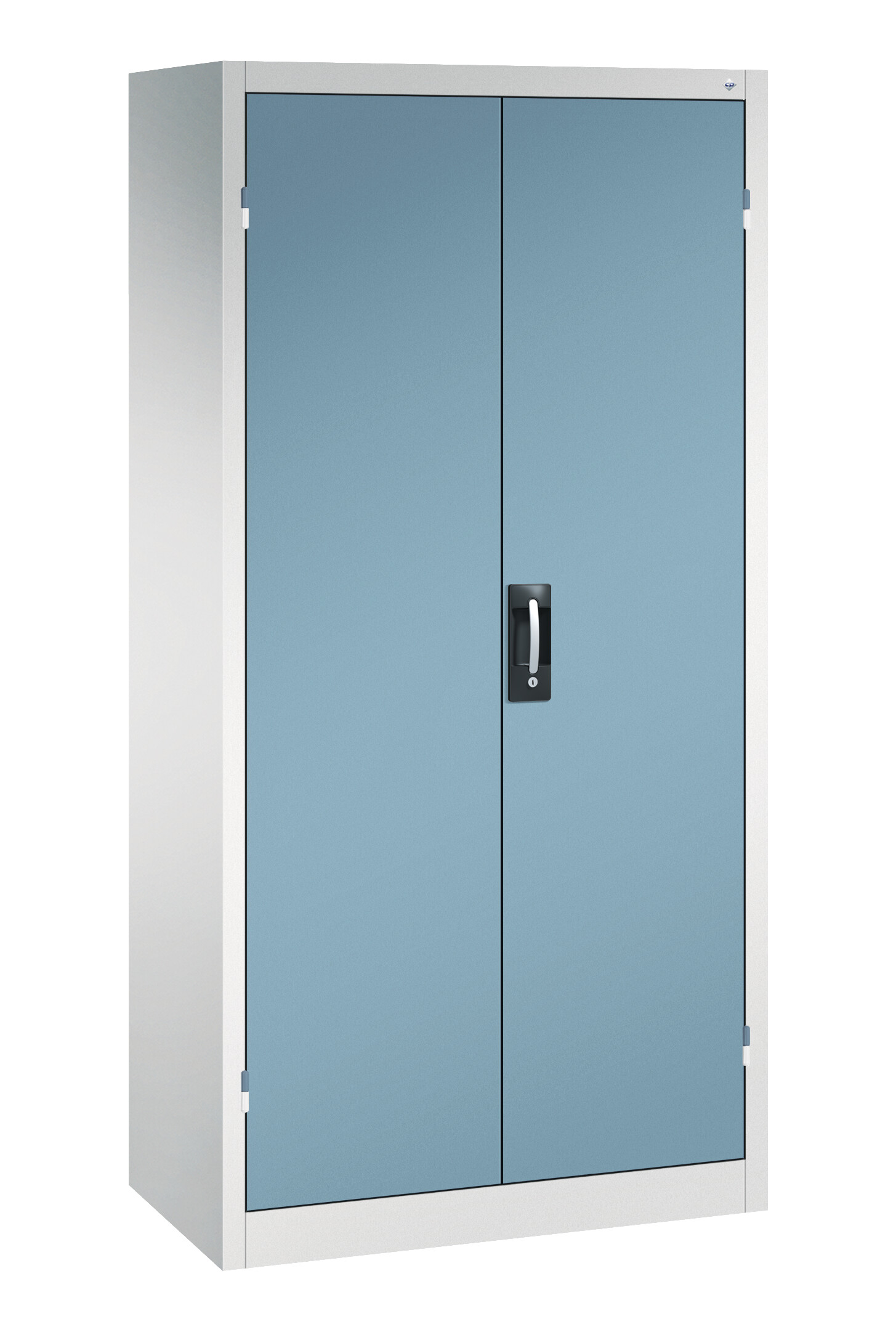 Stahl-Flügeltürenschrank Sport, als Sportgeräteschrank, Korpus aus stabiler Stahlkonstruktion mit hochwertiger Einbrennbeschichtung für hohe UV-Beständigkeit, mit Kunststoffgleitern als praktischer Schrank- und Fußbodenschutz, hohe Flexibilität der Inneneinrichtung durch Höhenverstellbarkeit im 15 mm Raster, Türen verstärkt für hohe Stabilität, Türaufhängung oben und unten in außen liegenden Scharnieren mit großzügigem Öffnungswinkel ca. 180 Grad, zueinanderschlagend für gemeinsamen Verschluss, Tür verstärkt für hohe Stabilität, Türaufhängung in außen liegenden Scharnieren mit großzügigem Öffnungswinkel ca. 180 Grad, 5 Einlegeböden aus Stahl lackiert, mit hoher Traglast von 70 kg, 1 Ergonomischer Muldengriff Ergo-Lock 4.0 für optimale Bedienungssicherheit und Verschleißfestigkeit, 3-Riegel-Verschluss, mit Zylinderschloss und 2 Schlüsseln, Maße (H x B x T): 1950 x 930 x 500 mm, Korpus: RAL 7035 Lichtgrau, Türen: RAL 5023 Fernblau, Inneneinrichtung: RAL 7035 Lichtgrau, Gewicht: 73 kgProduktvorteile:3-riegeliges Griffschloss "Ergo-Lock" mit 2 Schlüsseln und patentiertem Mechanismus: Zum Schließen einfach zudrückenHohe Flexibilität der Inneneinrichtung durch Verstellbarkeit im 15-mm-RasterHohe Traglast des Einlegebodens von 70 kg für flexible NutzungTüröffnungswinkel 180° für leichten und komfortablen Zugriff auf den SchrankinhaltTüren zueinander schlagend für gemeinsamen Verschluss