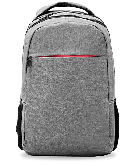 Rucksack für Laptop in Melange-OptikDoppelter Schultergurt und spezieller TragegriffZwei zentrale TaschenFronttasche mit Reißverschluss in Kontrastfarbe RedSeitliche NetztaschenHerausreißbares LabelWasserabweisendEinheitsgröße: 28 x 43 x 13 cmVolumen: ca 15 LiterLieferung ohne Inhalt/DekoMaterial: 100% PolyesterGrammatur: 400 g/m²Gewicht: 0.447Hergestellt nach: Oeko-Tex 100Veredelung: Bestickung, Bedruckung, BeflockungGröße: 28 x 43 x 13 cm