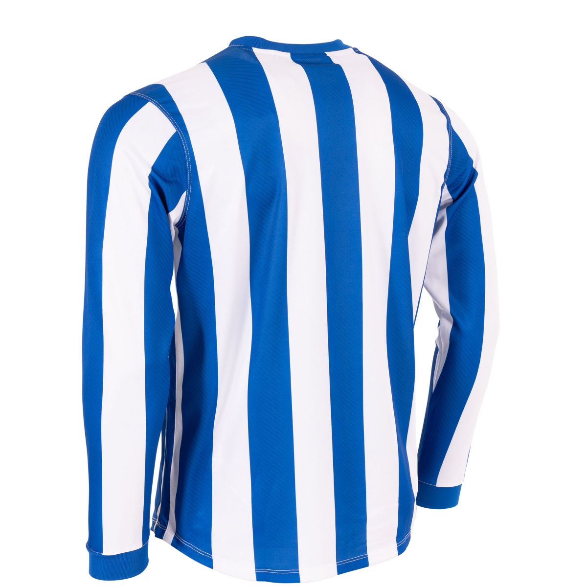 Das Stanno Aspire Langarm Trikot besteht aus 100% recyceltem Polyester mit ClimaTec-Finish und verfügt über ein sublimiertes Muster mit vertikalen Streifen. Auf der Vorderseite des Trikots befindet sich eine 20cm hohe Sponsorenfläche. Das Trikot verfügt über Stanno-Logos und eine Mesh-Struktur, die für einen optimalen Feuchtigkeitstransport sorgt. Das Shirt hat lange Ärmel mit Rippbündchen und doppelte Nähte, die es extra widerstandsfähig machen.