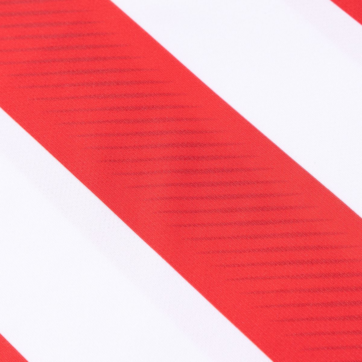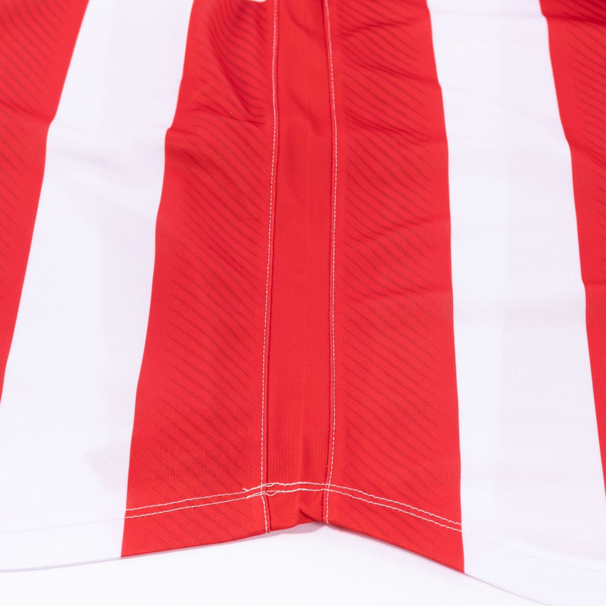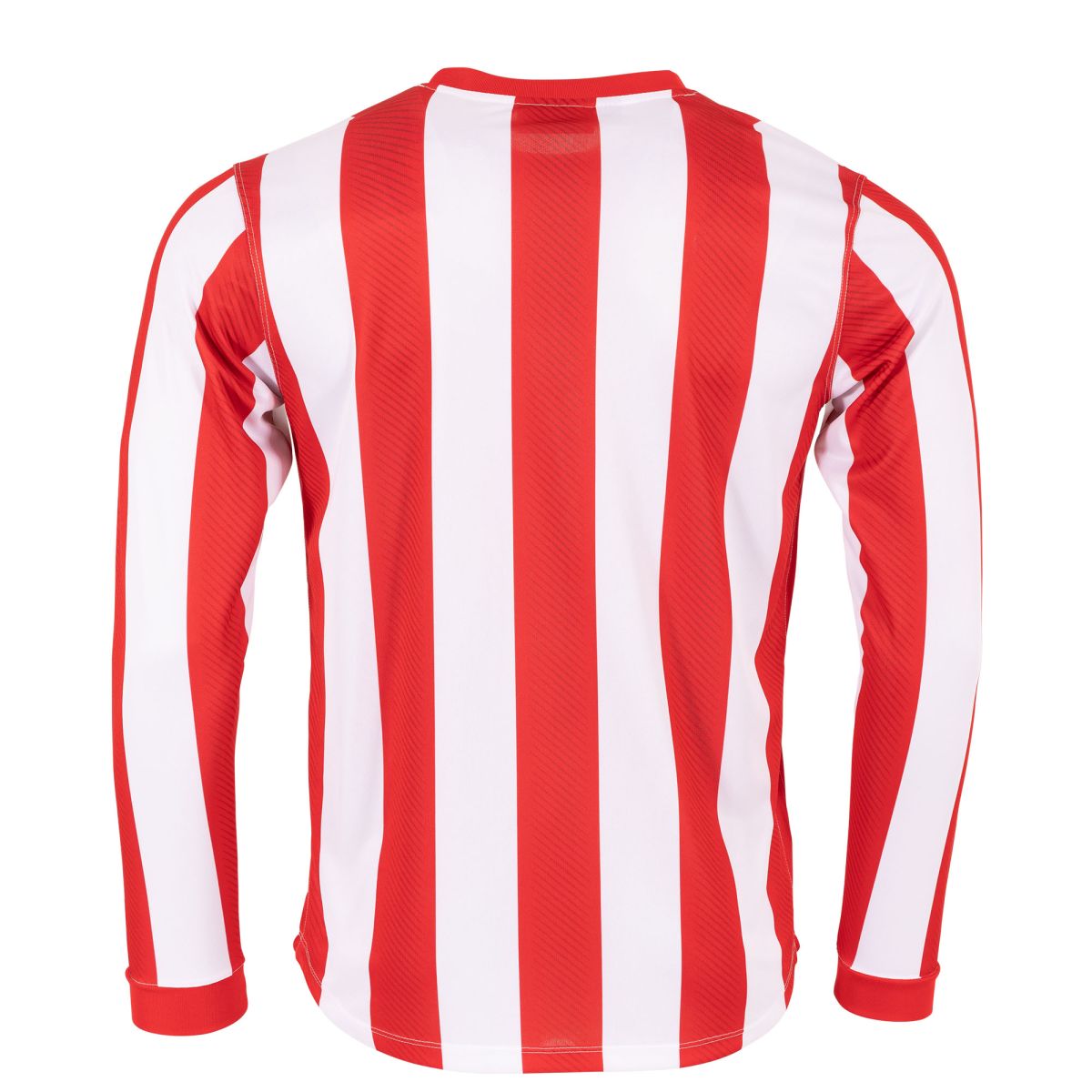 Das Stanno Aspire Langarm Trikot besteht aus 100% recyceltem Polyester mit ClimaTec-Finish und verfügt über ein sublimiertes Muster mit vertikalen Streifen. Auf der Vorderseite des Trikots befindet sich eine 20cm hohe Sponsorenfläche. Das Trikot verfügt über Stanno-Logos und eine Mesh-Struktur, die für einen optimalen Feuchtigkeitstransport sorgt. Das Shirt hat lange Ärmel mit Rippbündchen und doppelte Nähte, die es extra widerstandsfähig machen.