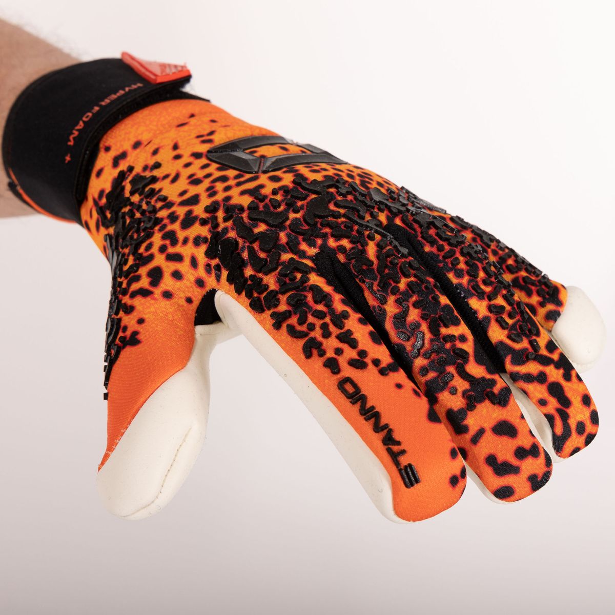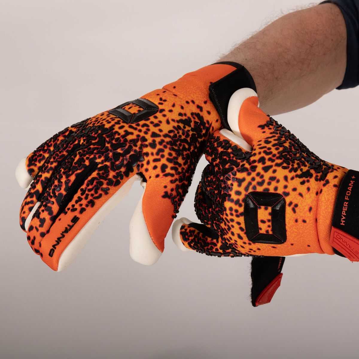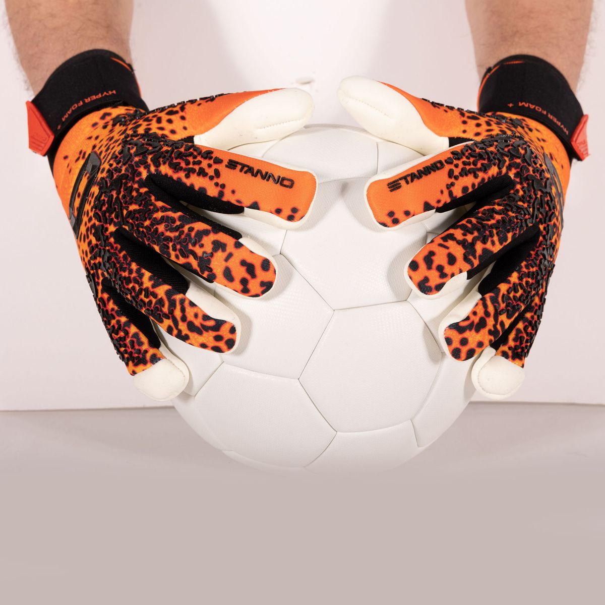 Die Blaze Torwarthandschuhe sind die absoluten Spitzenhandschuhe von Stanno. Sie haben eine extra große Schaumstoffoberfläche aus Hyper Foam Plus. Hyper Foam Plus ist ein ultra-weicher, dicker Schaumstoff, der sowohl bei trockenen als auch bei nassen Wetterbedingungen für noch mehr optimalen Grip sorgt. Die Handschuhe haben eine negativ genähte Rollfinger-Konstruktion am Daumen und kleinen Finger. Auf diese Weise sitzen die Handschuhe perfekt an der Hand! Die Hand ist außerdem vollständig von Schaumstoff umgeben. Die Schaumstoffoberfläche auf der Handinnenseite ist noch weiter vergrößert, wodurch die Fläche zum Fangen des Balls noch größer wird. Das Silikondesign an der Schlagzone und den Fingern sorgt für ein kontrollierteres Fausten des Balles. Das One Piece Fit Design garantiert zudem eine optimale Passform um die Oberhand. Die Verwendung eines Handgelenkbandes ist optional. Deshalb sind die Blaze Torwarthandschuhe mit einem abnehmbaren, elastischen Armband ausgestattet, das sich z.B. ideal zum Aufdrucken Deines Namens eignet.Veredelung: Bestickung, Bedruckung, BeflockungFarbe: Orange