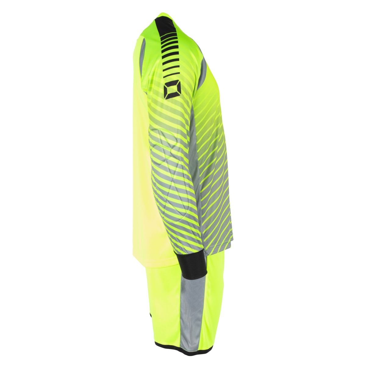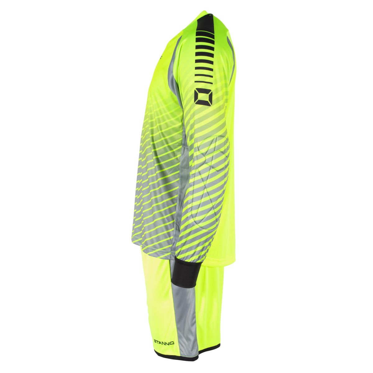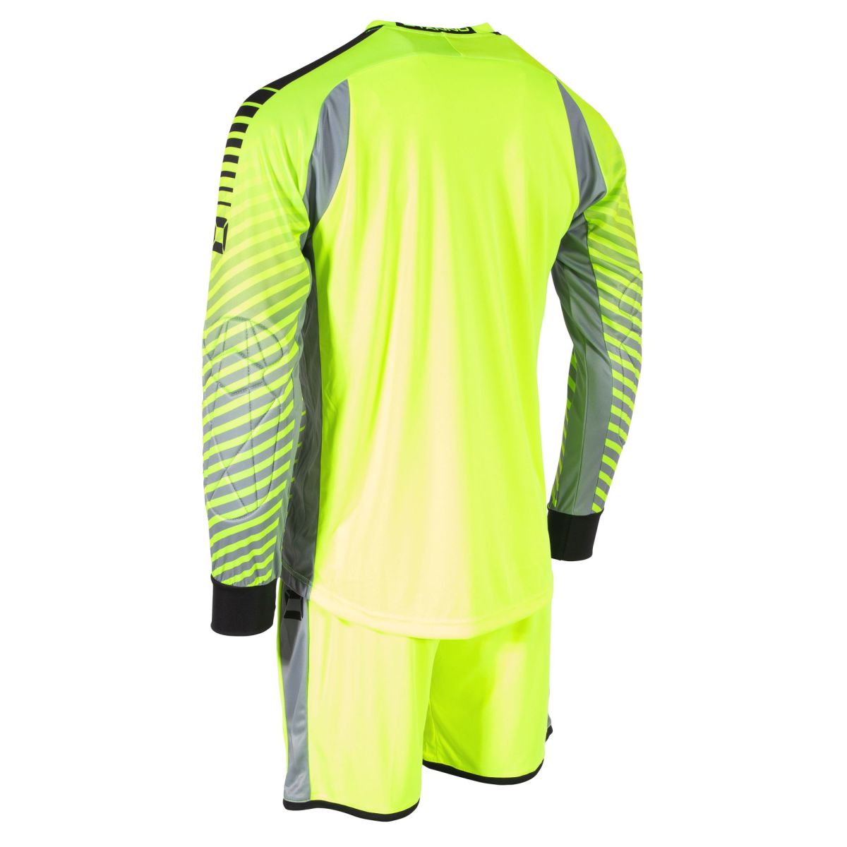 Dieses Torwartset von Stanno, mit sublimiertem Streifenprint auf dem Hemd, hat eine schützende Polsterung an den Ellenbogen. Der V-Ausschnitt ist aus Körpermaterial gefertigt, was dank der ClimaTec finish eine optimale Schweißabfuhr gewährleistet. Die eingearbeiteten Manschetten sind aus elastischem Rippenmaterial gefertigt. Die passende Shorts hat einen inneren und einen elastischen Bund mit Kordelzug.