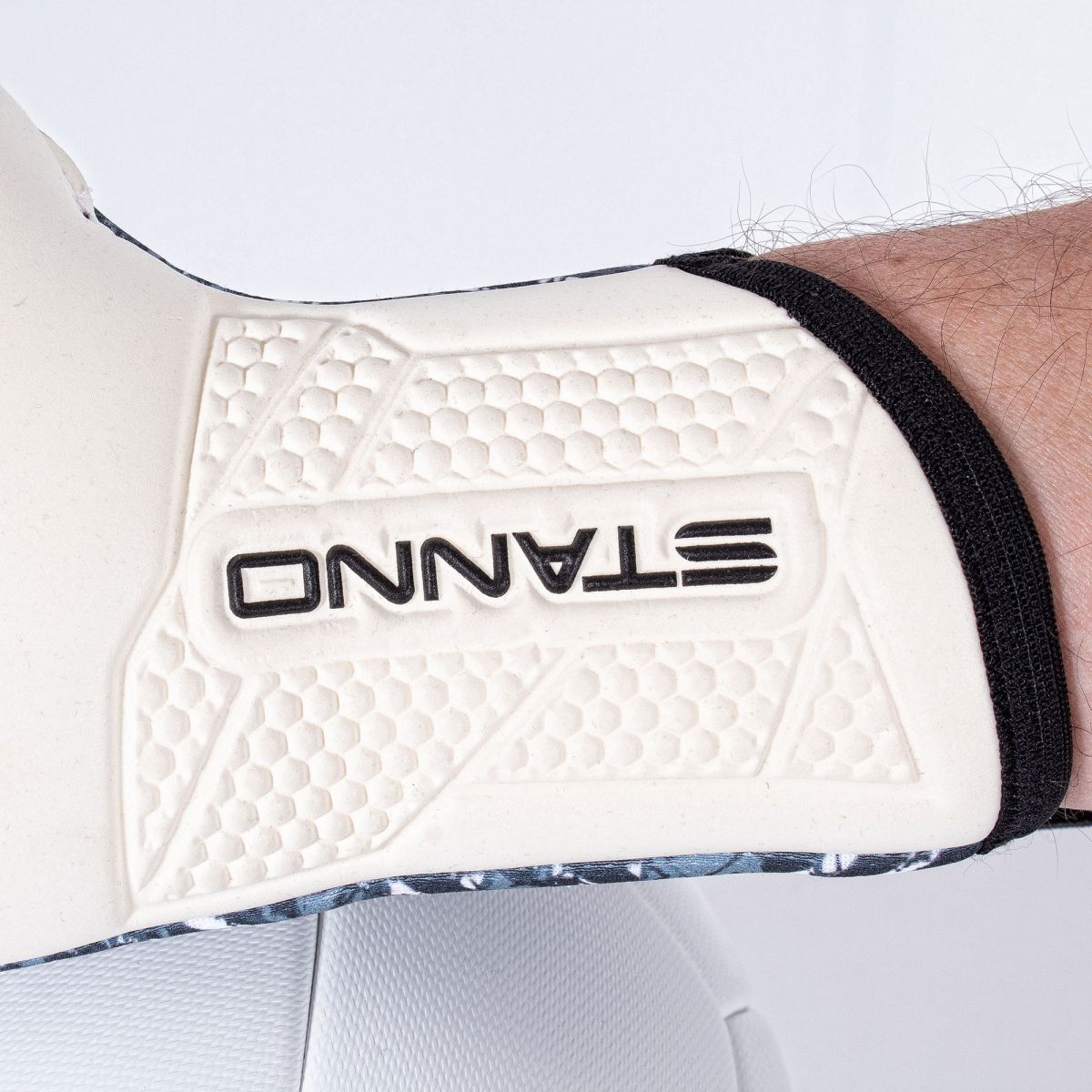 Der Volare Ultra ist der absolute Top-Torhüterhandschuh von Stanno mit Hyper Foam Plus und extra großer Schaumoberfläche. Der Handschuh ist extrem leicht dank der Verwendung der neuesten Techniken und Materialien.Der neue Hyper Foam Plus ist ein ultraweicher, dicker Schaum, der sowohl bei trockenem als auch bei nassem Wetter einen optimalen Halt bietet. Er hat ein noch höheres Absorptionsvermögen, das bei allen Wetterbedingungen einen kontinuierlichen feuchten Schaum gewährleistet. Dies verbessert den Grip und die hervorragende Schlagreduzierung erheblich und sorgt für eine noch bessere Ballkontrolle. Ein zusätzlicher Vorteil des Hyper Foam Plus ist die längere Lebensdauer. Der Handschuh hat eine negative RFH-Passform, wobei die Nähte an der Innenseite der Finger und dem Rollfingersystem kombiniert sind. Der Handschuh schließt daher enger um die Finger, ist aber auch vollständig von Schaum umgeben. Die Schaumoberfläche auf der Innenseite der Hand wird noch weiter vergrößert, wodurch die Oberfläche zum Auffangen des Balls noch größer wird.Der Silikoneinsatz an der Stanzzone und an den Fingern bietet eine gute Flexibilität, die das Ballgefühl erhöht. Das One Piece Fit Design (OPF) garantiert auch eine optimale Passform um die Oberhand. Der Handschuh liegt so gut um die Hand, dass die Verwendung einer Handschlaufe optional ist. Aus diesem Grund ist der Volare Ultra mit einem abnehmbaren, elastischen, flachen Armband ausgestattet (individualsierbar).Die geprägte Handfläche bereichert das Design des Stanno Volare Ultra.