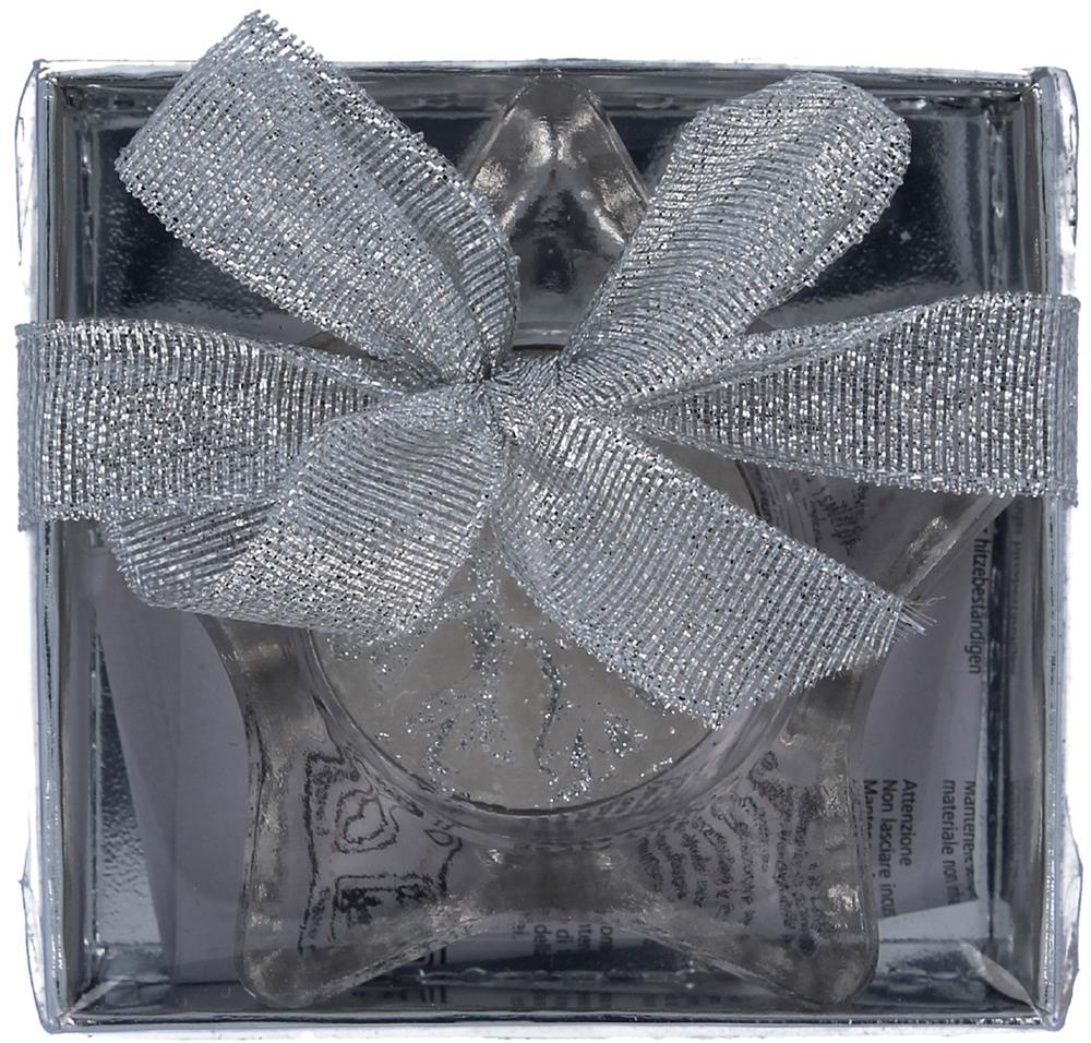 Sternförmiger Teelichthalter aus Glas. Geschenkverpackung mit transparentem Deckel und silbernem Band. Teelicht enthalten.