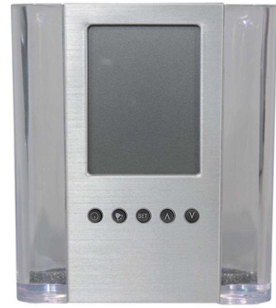 Stiftehalter mit Zeit-, Kalender-, Temperaturanzeige, Alarm mit Snoozefunktion. Die Uhr ist abnehmbar. Inkl. einer Knopfzelle.