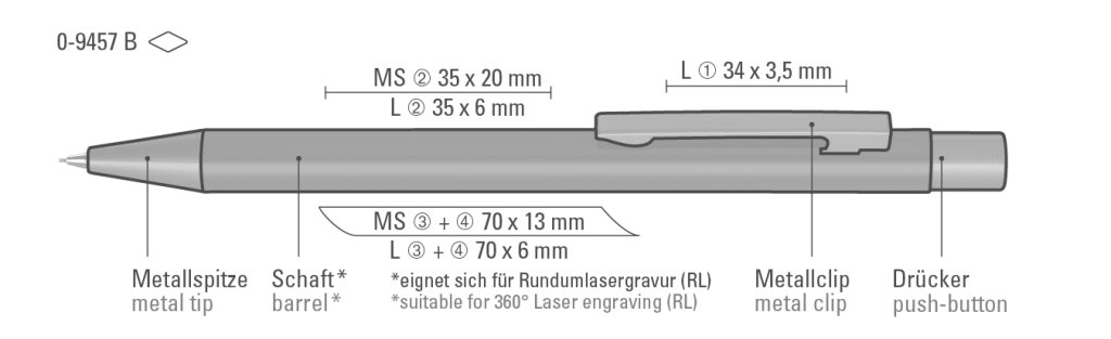 Druckbereich: Auf dem Clip 34mm x 3,5mm Lasergravur (L), in Clipverlängerung 35mm x 6mm Lasergravur (L), in Clipverlängerung 35mm x 20mm Siebdruck (MS), gegenüber vom Clip 70mm x 6mm Lasergravur (L), gegenüber vom Clip 70mm x 13mm Siebdruck (MS), seitlich vom Clip 70mm x 6mm Lasergravur (L), seitlich vom Clip 70mm x 13mm Siebdruck (MS), Druckfläche 85mm x 30mm Rundumlasergravur (RL), auf dem Clip 34mm x 3,5mm Einzelnamensgravur (EL), in Clipverlängerung 35mm x 6mm Einzelnamensgravur (EL), gegenüber vom Clip 70mm x 6mm Einzelnamensgravur (EL), seitlich vom Clip 70mm x 6mm Einzelnamensgravur (EL)