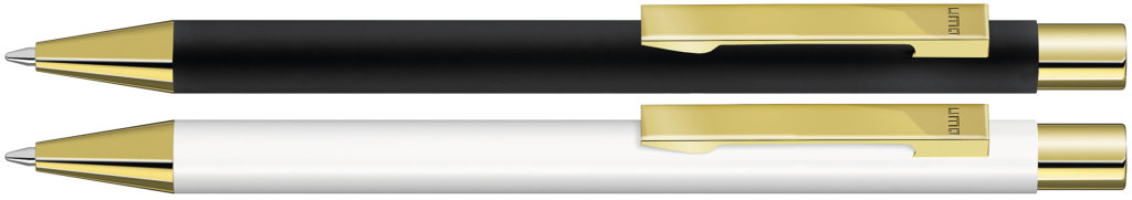 Metall-Druckkugelschreiber mit mattem Gehäuse in weiß oder schwarz. Metallclip, Metallspitze und Drücker gold glänzend.