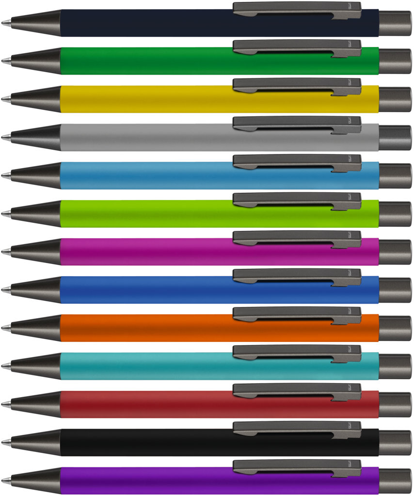 Metall-Druckkugelschreiber mit Softtouch-Gehäuse. Metallclip, Metallspitze und Drücker GUN metallic.Druckbereich: Auf dem Clip 34mm x 3,5mm Lasergravur (L), in Clipverlängerung 35mm x 6mm Lasergravur (L), gegenüber vom Clip 70mm x 6mm Lasergravur (L), seitlich vom Clip 70mm x 6mm Lasergravur (L), Druckfläche 85mm x 30mm Rundumlasergravur (RL), in Clipverlängerung 35mm x 20mm Siebdruck (GS), gegenüber vom Clip 70mm x 13mm Siebdruck (GS), seitlich vom Clip 70mm x 13mm Siebdruck (GS), auf dem Clip 34mm x 3,5mm Einzelnamensgravur (EL), in Clipverlängerung 35mm x 6mm Einzelnamensgravur (EL), gegenüber vom Clip 70mm x 6mm Einzelnamensgravur (EL), seitlich vom Clip 70mm x 6mm Einzelnamensgravur (EL)