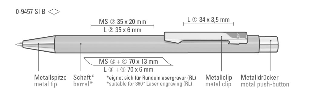 Druckbereich: Auf dem Clip 34mm x 3,5mm Lasergravur (L), in Clipverlängerung 35mm x 6mm Lasergravur (L), in Clipverlängerung 35mm x 20mm Siebdruck (MS), gegenüber vom Clip 70mm x 6mm Lasergravur (L), gegenüber vom Clip 70mm x 13mm Siebdruck (MS), seitlich vom Clip 70mm x 6mm Lasergravur (L), seitlich vom Clip 70mm x 13mm Siebdruck (MS), Druckfläche 85mm x 30mm Rundumlasergravur (RL), auf dem Clip 34mm x 3,5mm Einzelnamensgravur (EL), in Clipverlängerung 35mm x 6mm Einzelnamensgravur (EL), gegenüber vom Clip 70mm x 6mm Einzelnamensgravur (EL), seitlich vom Clip 70mm x 6mm Einzelnamensgravur (EL)