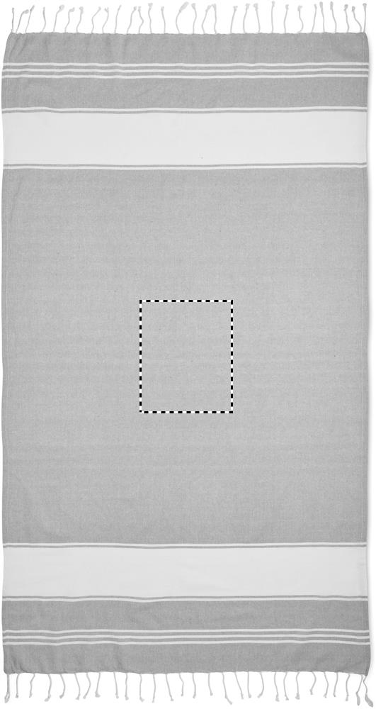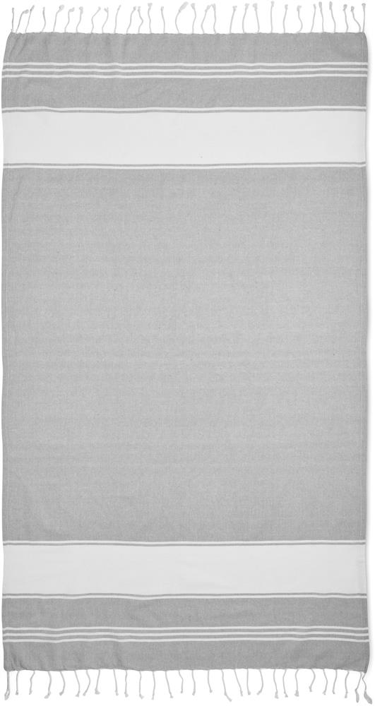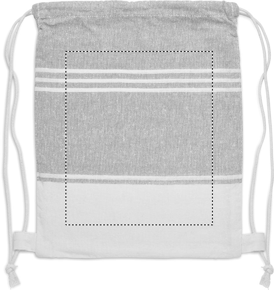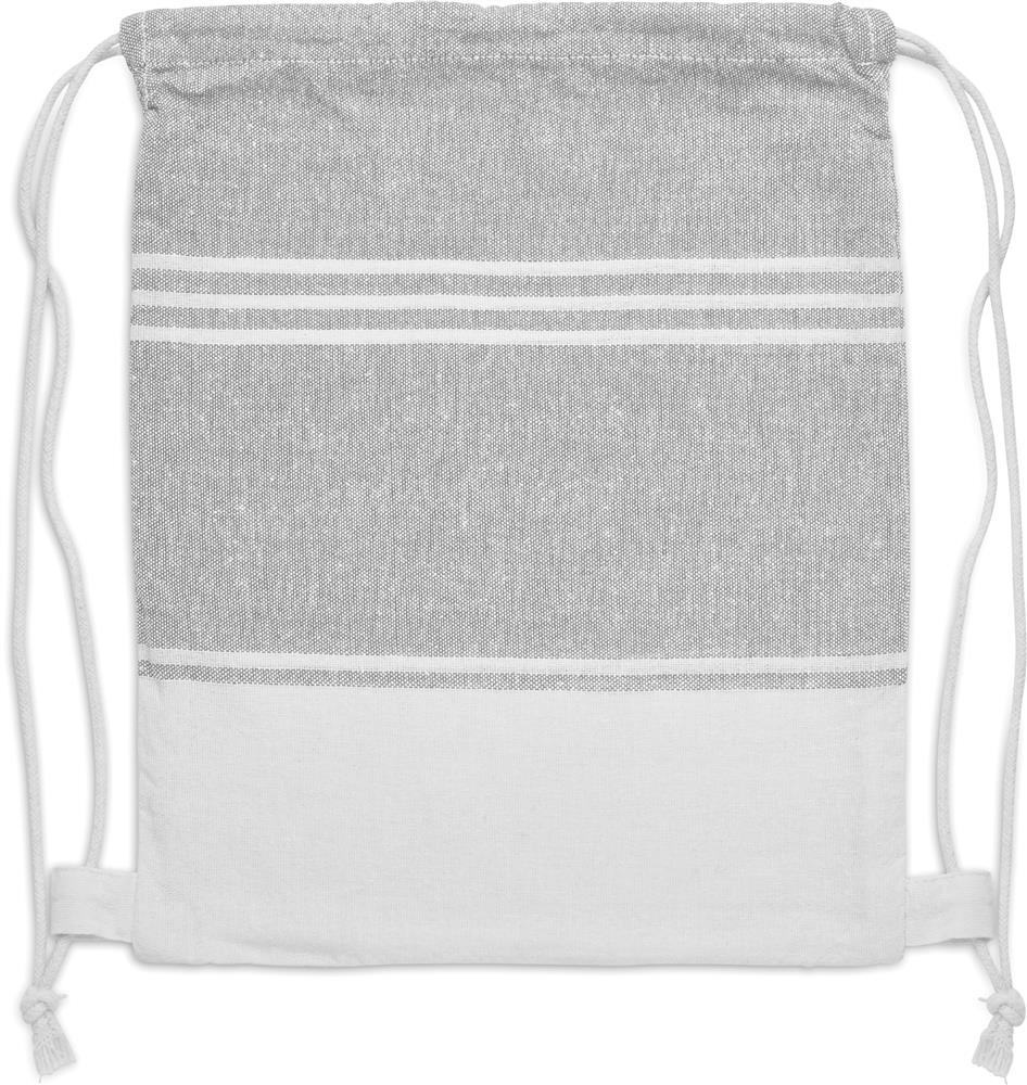 Strandtuch/Hammamtuch im passenden Beutel mit Kordelzug. 70% recycelte Baumwolle und 30% recycelter Polyester 180 g/m². Maße Tuch: 90x160 cm.