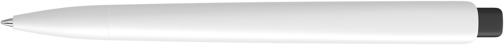 Druckkugelschreiber mit geometrisch wechselnder Schaftform. Gehäuse gedeckt matt schwarz oder weiß mit Bogenclip und farbigem Drücker.