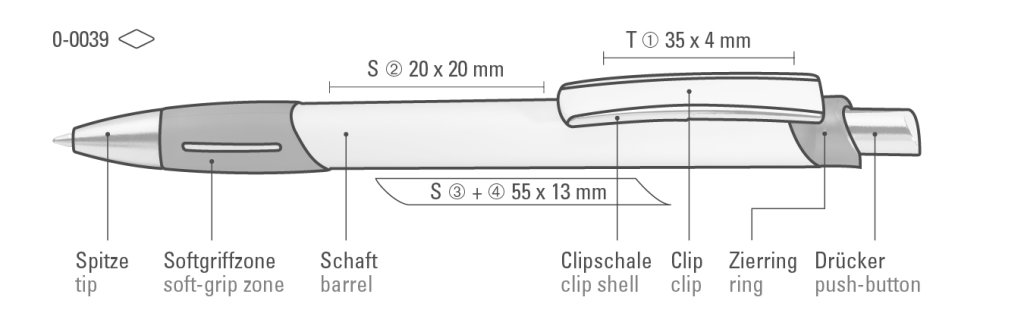 Druckbereich: Auf dem Clip 35mm x 4mm Tampondruck (T), in Clipverlängerung 20mm x 20mm Siebdruck (S), gegenüber vom Clip 55mm x 13mm Siebdruck (S), seitlich vom Clip 55mm x 13mm Siebdruck (S)