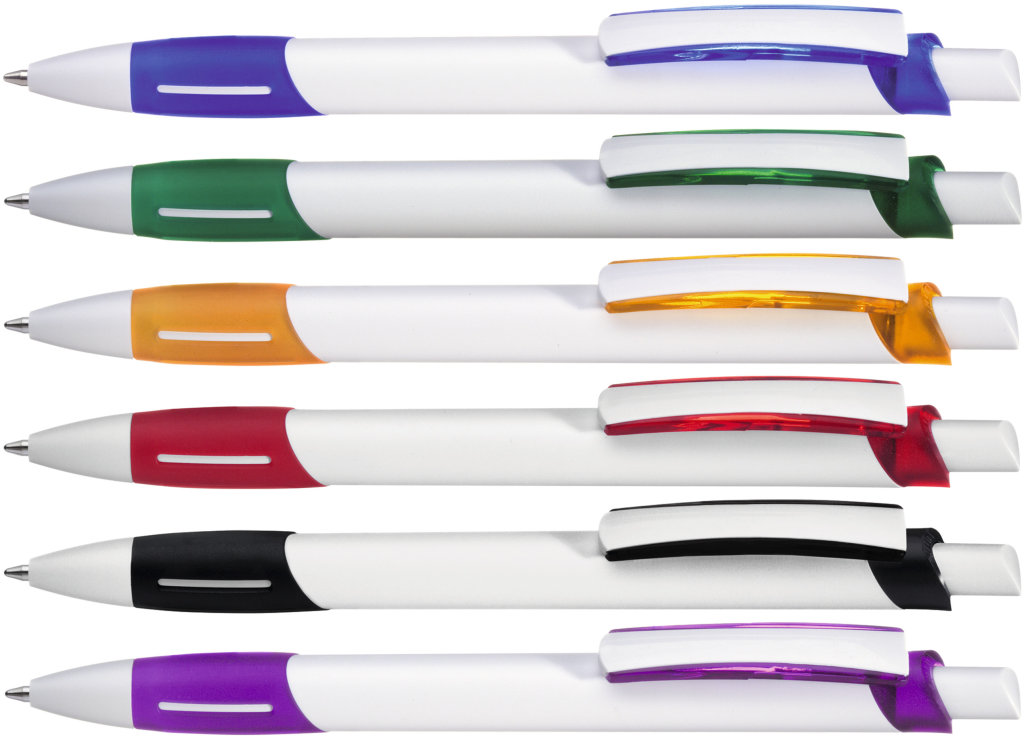 Weißer Kunststoff-Kugelschreiber mit farbigem Clip, blauschreibend.Maße: ø10×138 mmSchreibgerät-Typ: KugelschreiberSchreibgerät-Mechanik: DruckmechanikSchreibfarbe: BlauMinentyp: Normale MineLinienstärke: 1 mmMaterial: Kunststoff (ABS)Veredelungsposition 1: Korpus - rechts vom ClipTechnologie: UV-LED-Druck - EinzelnamenDurchmesser: 0Druckcode: NUVATechnologie: TampondruckMaximale Farben: 4Durchmesser: 0Druckcode: P0Technologie: TampondruckMaximale Farben: 1Durchmesser: 0Druckcode: P1Technologie: UV LED DruckDurchmesser: 0Druckcode: UVAVeredelungsposition 2: Korpus - links vom ClipTechnologie: UV-LED-Druck - EinzelnamenDurchmesser: 0Druckcode: NUVATechnologie: TampondruckMaximale Farben: 4Durchmesser: 0Druckcode: P0Technologie: TampondruckMaximale Farben: 1Durchmesser: 0Druckcode: P1Technologie: UV LED DruckDurchmesser: 0Druckcode: UVAVeredelungsposition 3: KlipTechnologie: TampondruckMaximale Farben: 4Durchmesser: 0Druckcode: P0Veredelungsposition 4: Korpus - in Verlängerung vom ClipTechnologie: TampondruckMaximale Farben: 4Durchmesser: 0Druckcode: P0