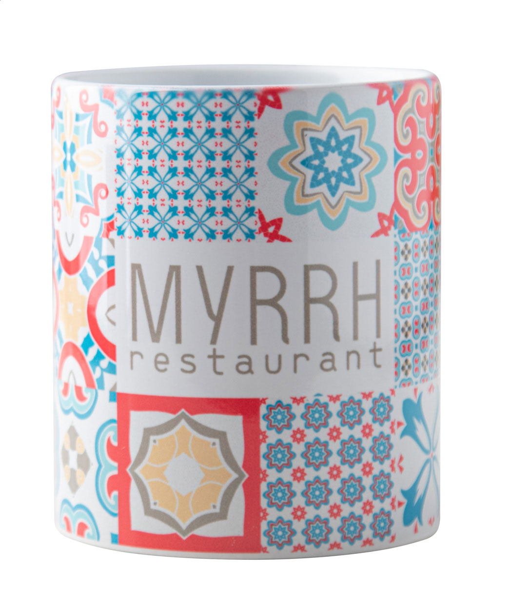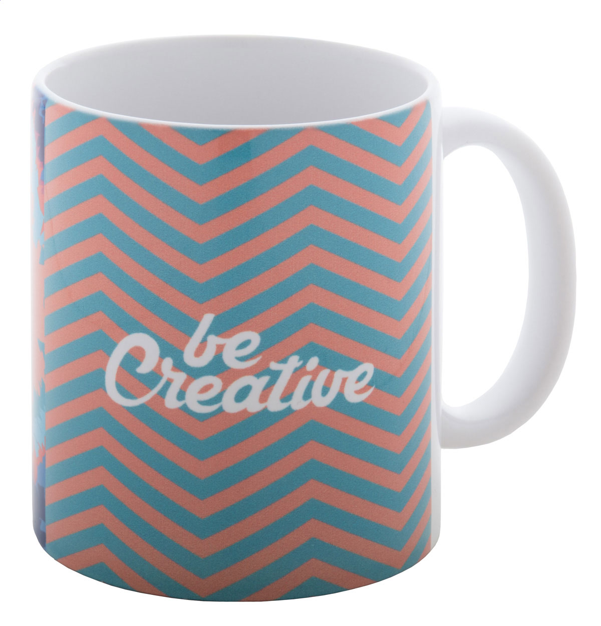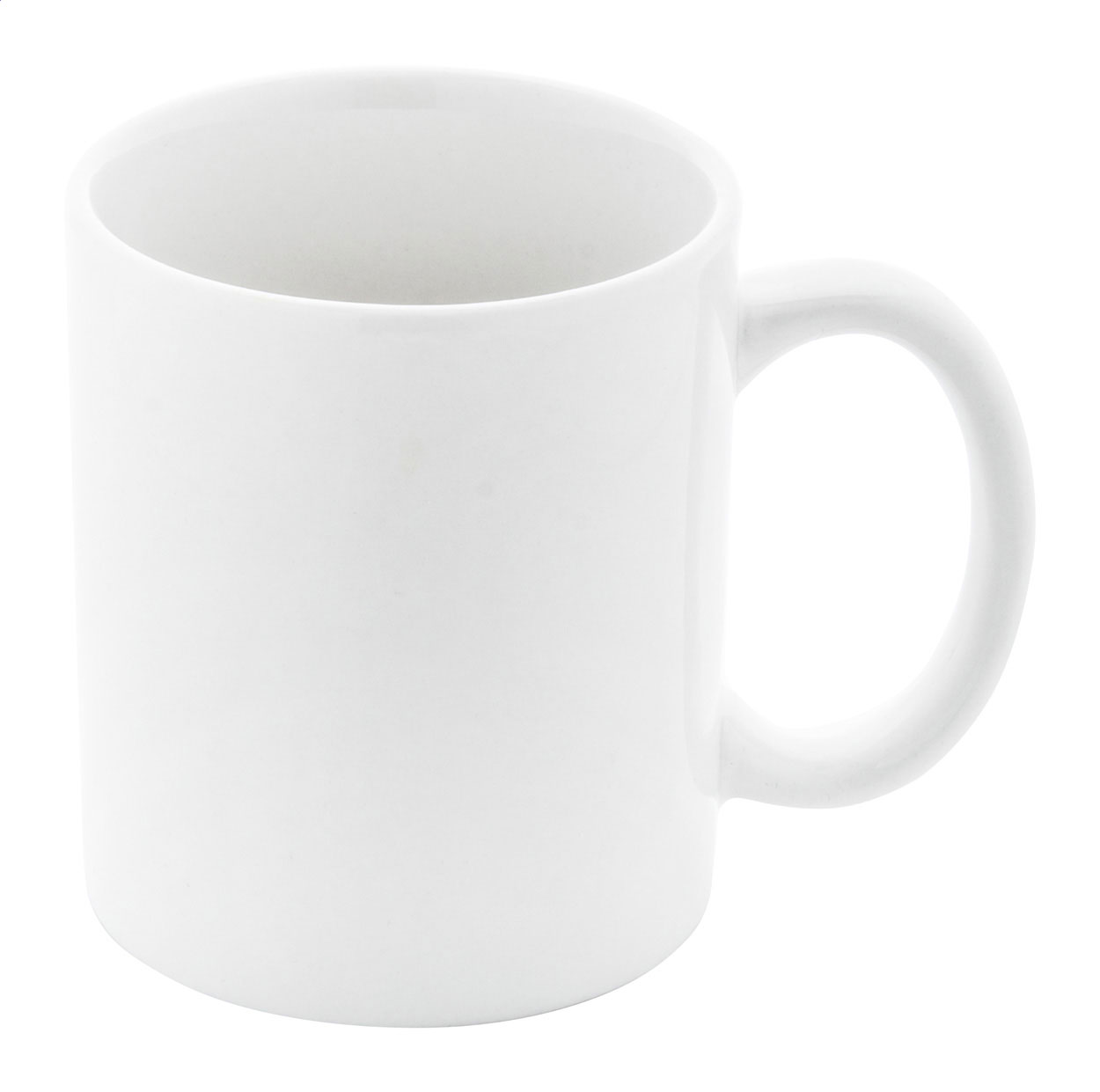 Weißer Keramikbecher, ideal für Sublimationsdruck, spülmaschinengeeignet. Füllmenge: 300 ml. In weißem Einzelkarton.