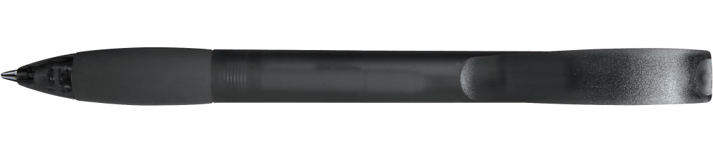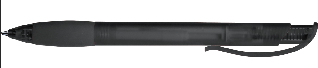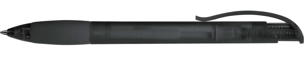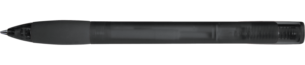 Druckkugelschreiber mit transparent gefrostetem Gehäuse, Gummigriffzone und Clipdrücker mit Stopfen.