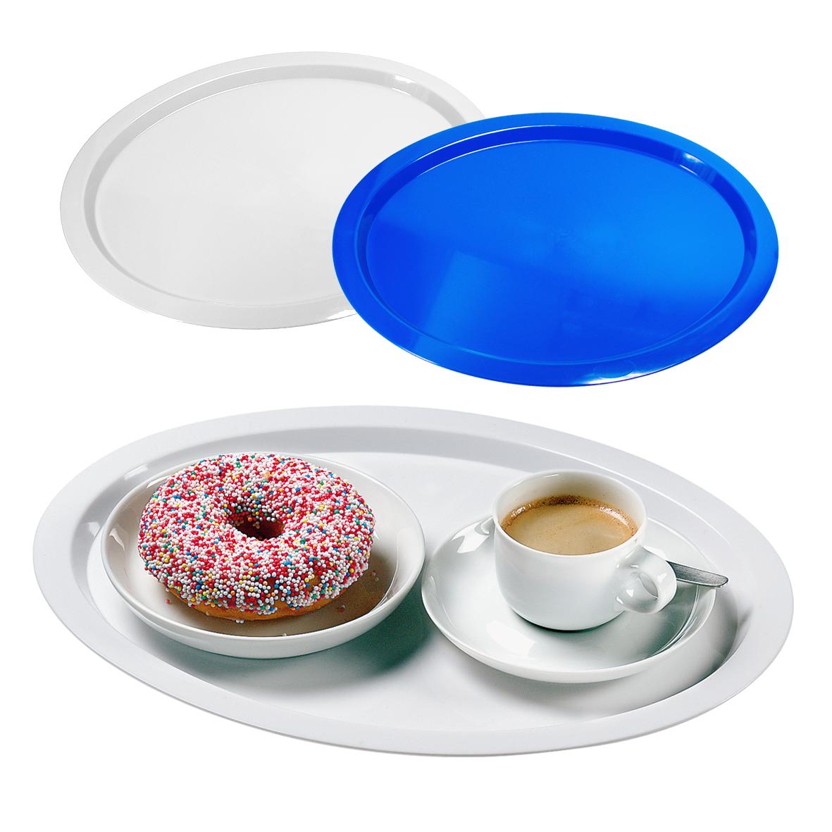 Ovales Tablett aus stabilem Kunststoff mit großer Werbefläche und niedrigem Rand zur besseren Handhabung. Besonders geeignet zum Servieren von Kaffee oder Tee.