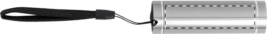 1 LED-Taschenlampe aus recyceltem Aluminium mit Trageriemen. Funktioniert mit 3 AAA-Batterien, ohne Batterien.