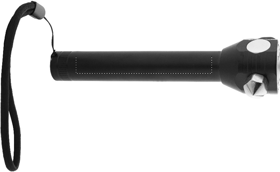 3in1 Aluminium-Taschenlampe mit Nothammer und Sicherheitsgurtschneider. Mit eingebautem USB-Akku (500 mAh), Magnet und Tragegurt. Mit hochleistungsfähigem COB-Licht an der Front und COB-Flutlicht an der Seite. Inklusive USB-Ladekabel.