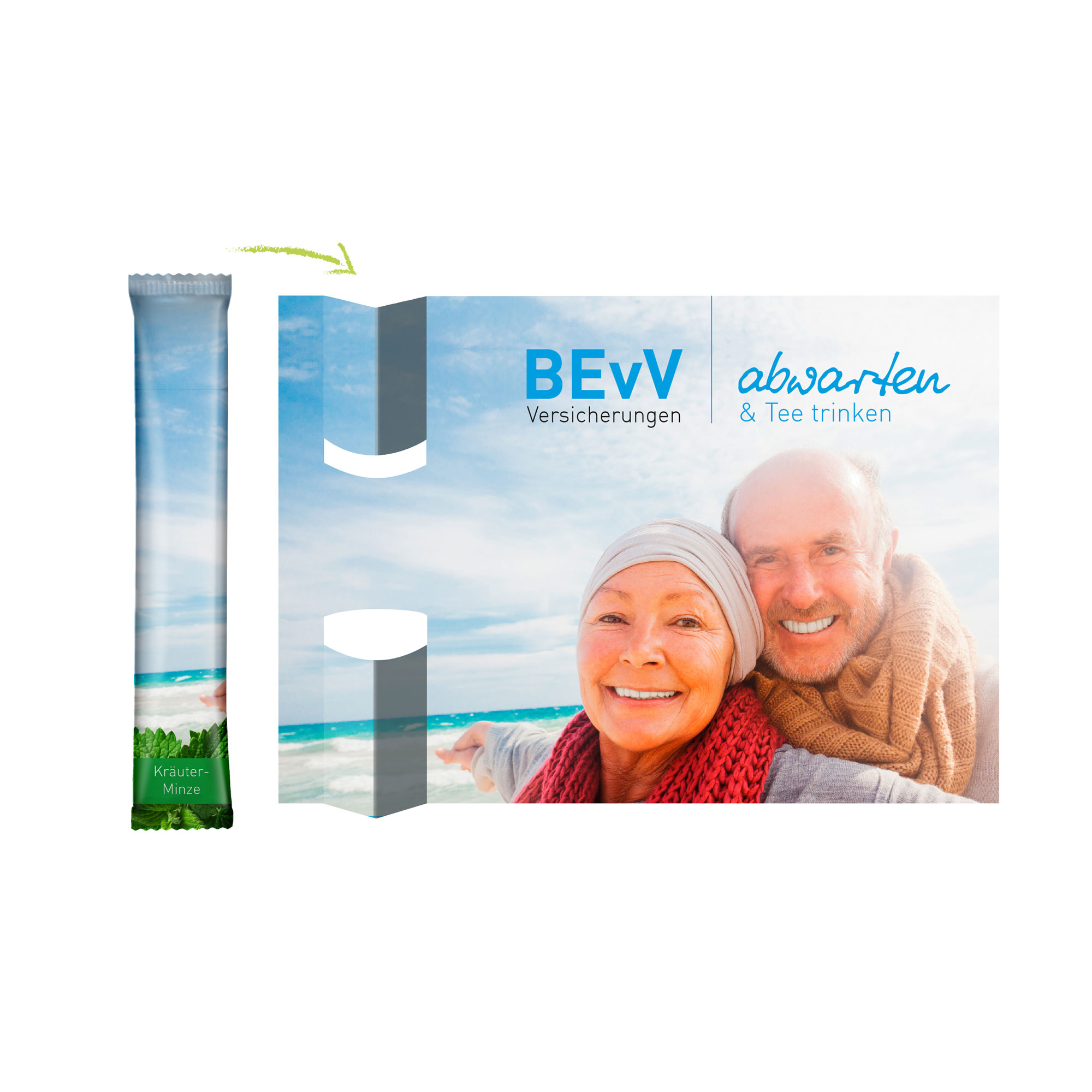 Bio TeaStick (Premium Selection). Der innovative TeaStick ist purer Genuss und dabei noch sehr praktisch: Stick direkt in die Tasse mit heißem Wasser geben, ziehen lassen, fertig! Durch die Perforation zirkuliert das Wasser, das Vlies hält Brösel sicher zurück. Erhältlich in 5 Sorten: Kräuter Rooibos-Minze, Rooibos Energy, Grüner Tee Ingwer Zitrone, Schwarztee Earl Grey und Früchte Tee. BIO Kontrollstelle DE-ÖKO-37. Auch erhältlich mit diversen Verpackungen, als Geschenksets oder mit individuell bedruckter Aromaschutzverpackung.Zertifizierung: BIO zertifiziert (DE-ÖKO-37)Bedruckung: Premium Selection DesignDruckfläche: -Druckfarben: -Druckart: -Druckgruppe: 999Zutaten:---------------Je nach gewählter Sorte. Zutaten siehe Einzelsorten.Mindeshaltbarkeit: Mind. 30 MonateGewicht: 2 gMaterial: FolieMaße: 158 x 27 x 15 mm