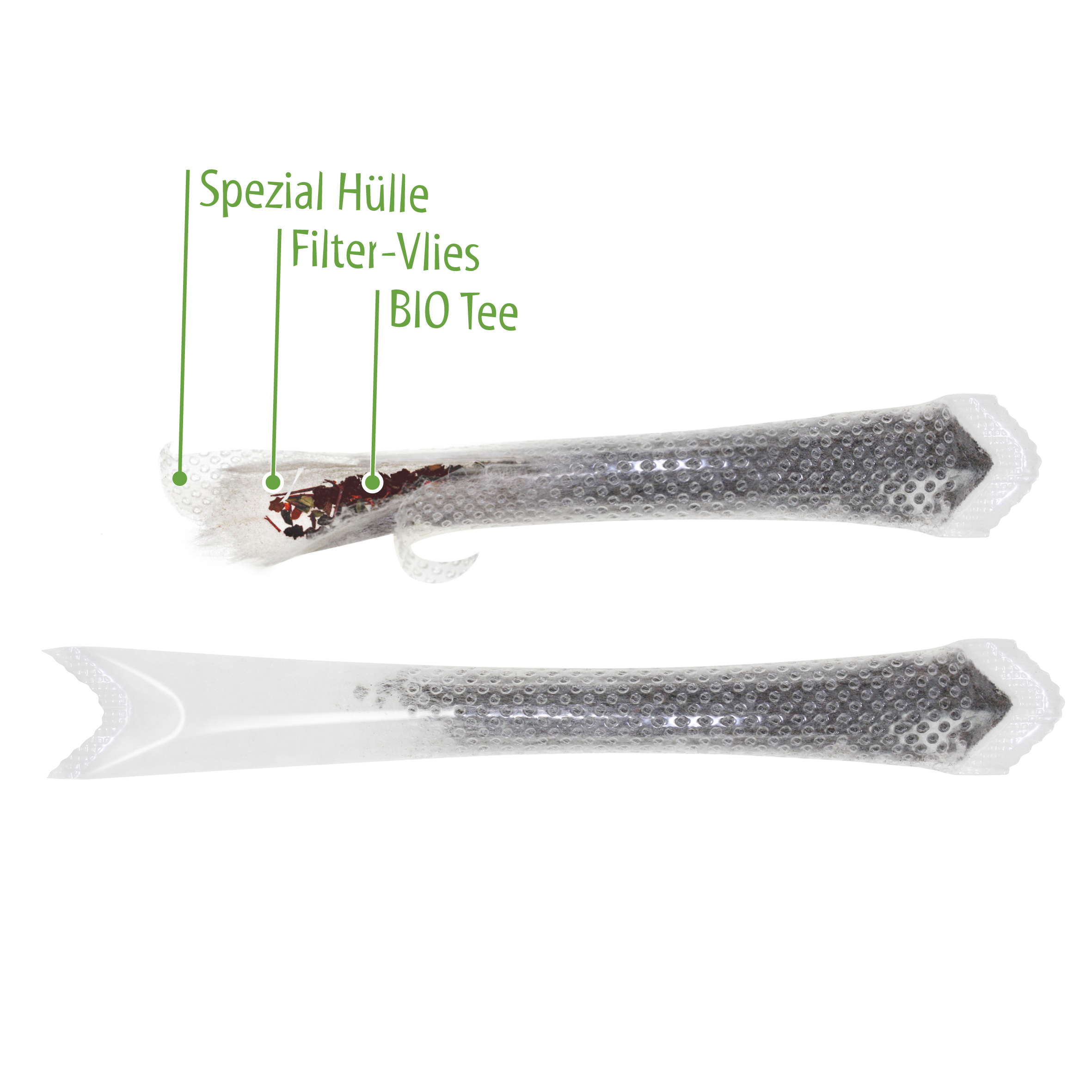 Inklusive 1 Bio TeaStick (konfektionierte Lieferung): Der innovative TeaStick ist purer Genuss und dabei noch sehr praktisch. Stick direkt in die Tasse mit heißem Wasser geben, ziehen lassen, fertig! Durch die Perforation zirkuliert das Wasser, das Vlies hält Brösel sicher zurück.