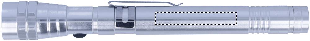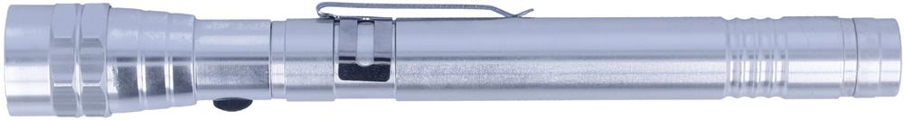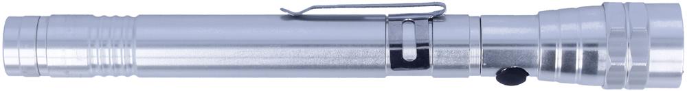 Teleskop Taschenlampe mit 3 LED Leuchten. Der obere Teil der Lampe ist flexibel und mit einem Magneten ausgestattet. Seitlicher Clip. Maximale Länge ausgezogen 57 cm. Inklusive 4 x LR44 Batterien.Material: AluminiumMaße: Ø2,2x17 cmGewicht: 0.096 kgVeredelung: Bestickung, Bedruckung, BeflockungHandling/Farbcodes: B/03, 14Druckposition: BARREL RIGHTDruckmaße: 45 x 7 mmDrucktechniken: L2, P6Druckposition: BARREL LEFTDruckmaße: 45 x 7 mmDrucktechniken: L2, P6