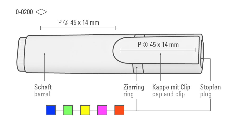 Druckbereich: Auf dem Clip 45mm x 14mm Sonderdruck (P), in Clipverlängerung 45mm x 14mm Sonderdruck (P)