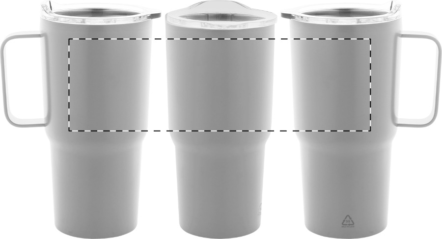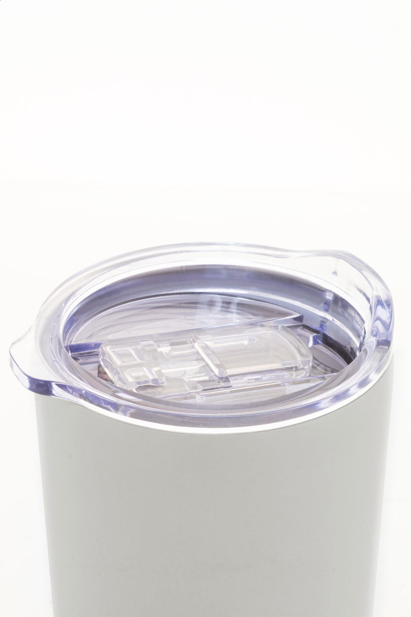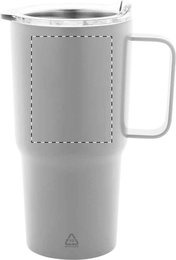 Doppelwandiger, vakuumisoloierter Thermobecher aus recyceltem Edelstahl mit Trinkdeckel aus PS Kunststoff. Füllmenge: 600 ml.